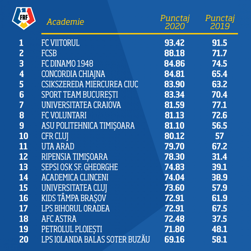Surpriza vine din partea Academiei FCSB, care a urcat pe locul 2 in topul celor mai bune academii de fotbal, cu 88.18 puncte, inregistrad o crestere cu 16 puncte fata de anul trecut.