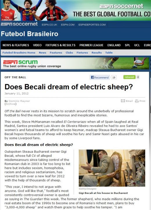"Oare Gigi Becali viseaza la oi electrice?", este titlul unui articol ironic din ESPN, care ironizeaza declaratiile de la inceput de an facute de patronul Stelei.