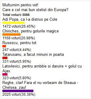 De asemenea, un lucru surprinzator este dat de alegerea lui Adi Popa pe locul doi, mijlocasul de banda fiind considerat cel mai bun jucator si omul care a 'dat tonul' performantelor din acest sezon. Popa este urmat de Chiriches in topul preferintelor, apoi, in ordine, de Tatarusanu, Latovlevici si Rusescu.