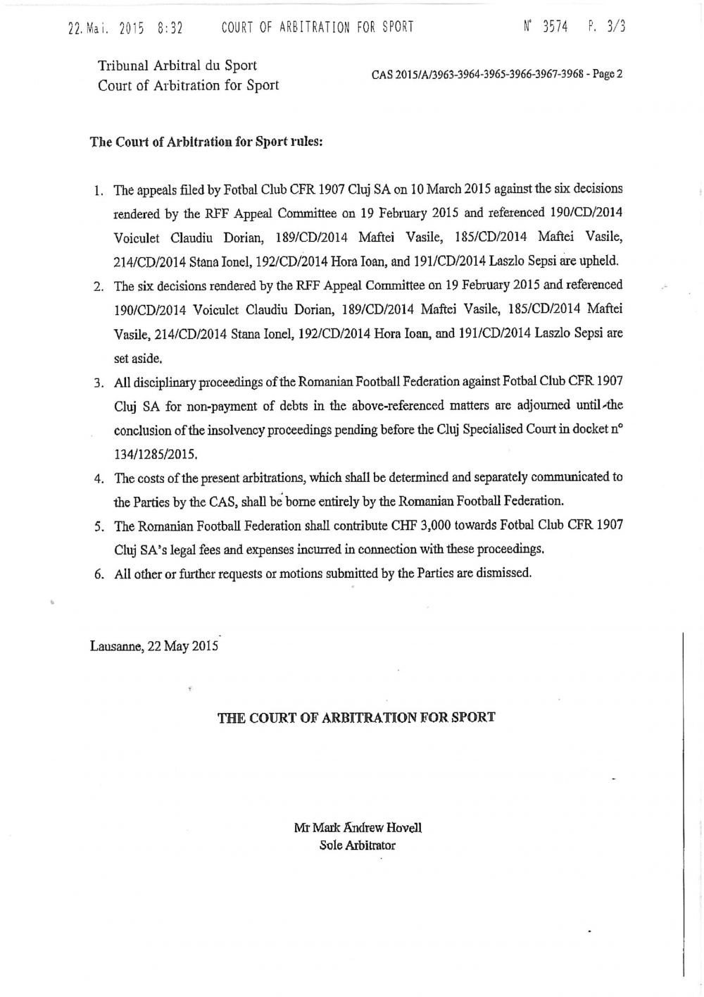 UPDATE 10:55 CFR Cluj a publicat pe site-ul oficial decizia transmisa prin fax de TAS catre club