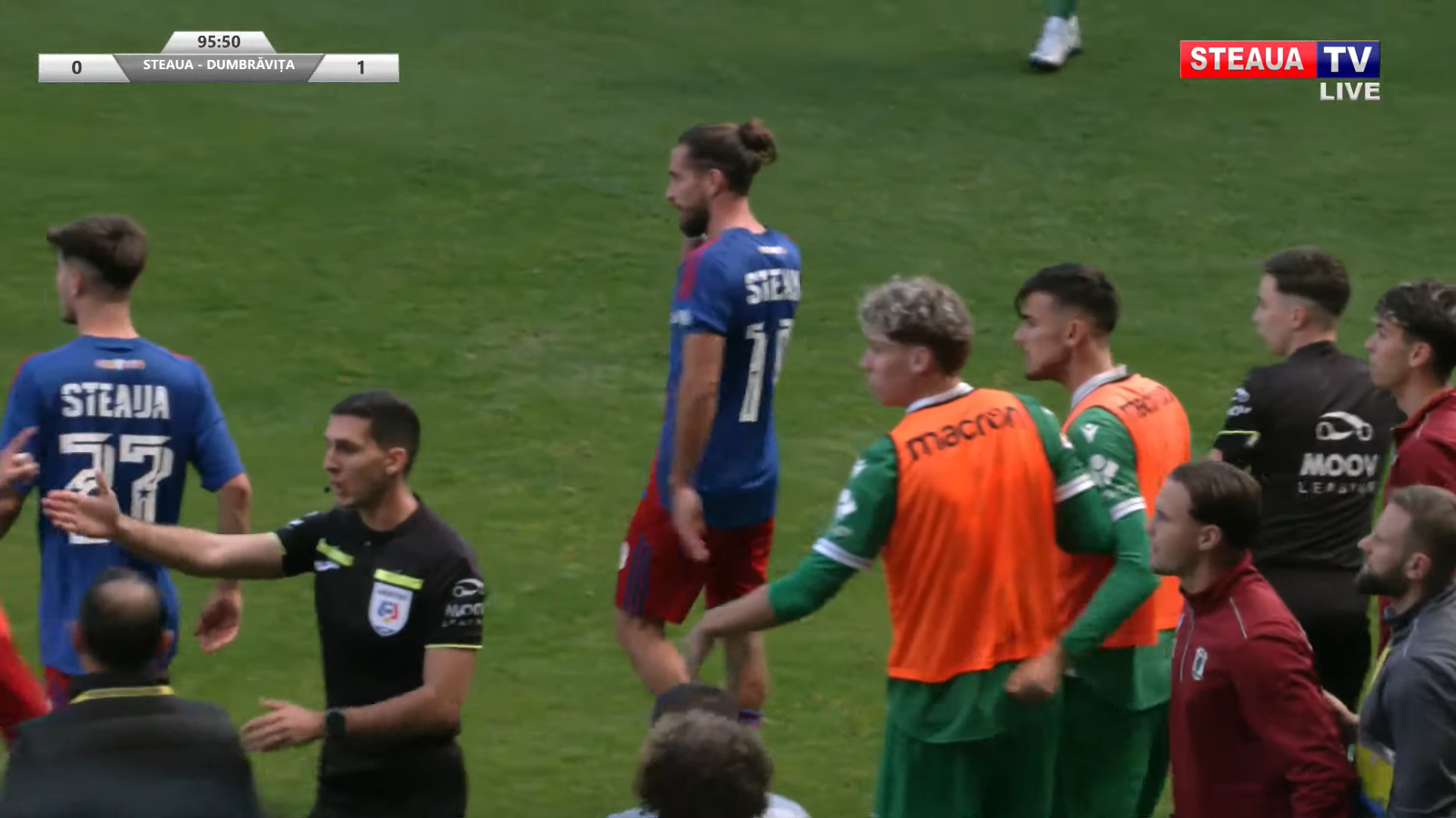 Jocul s-a reluat ulterior pentru câteva secunde, apoi s-a fluierat finalul, moment în care a izbucnit un nou conflict între jucători. Stelistul Adrian Ilie a fost din nou în centrul scandalului.