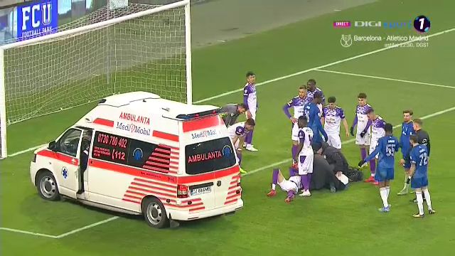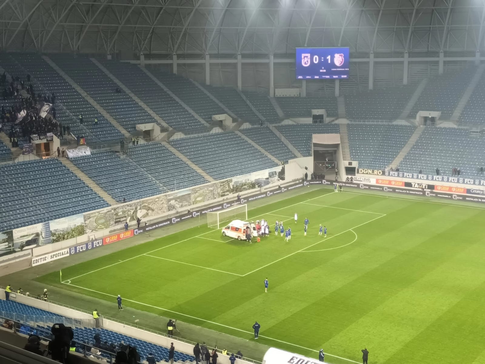 Ambulanța a intrat imediat pe teren, iar echipa medicală i-a acordat primul ajutor fundașului piteștean. După câteva momente, Tudose s-a ridicat, iar jocul s-a reluat cu un corner pentru Craiova.
