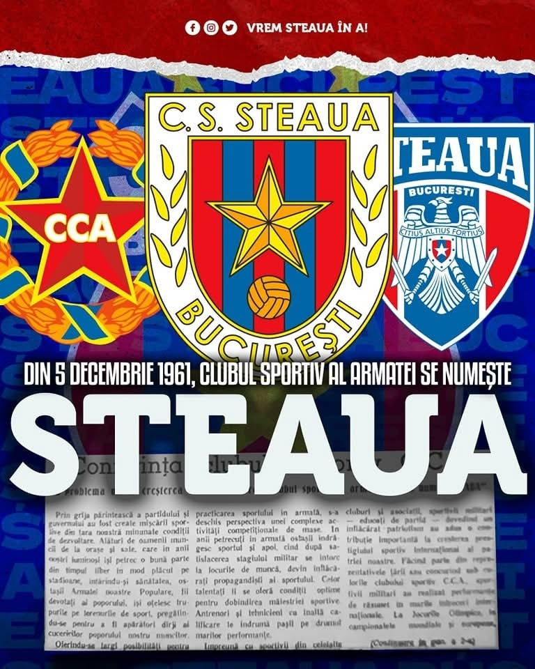 În timp ce unii susțin, din prostie, că ei poartă numele de Steaua, alții ignoră hotărârile instanțelor judecătorești, presa încearcă să știrbească din prestigiul acestui brand, iar MApN se confruntă cu dificultăți în găsirea unei soluții pentru a readuce acest nume în fruntea fotbalului românesc, să ne amintim cum, pe 5 decembrie 1961, CCA devenea Steaua.