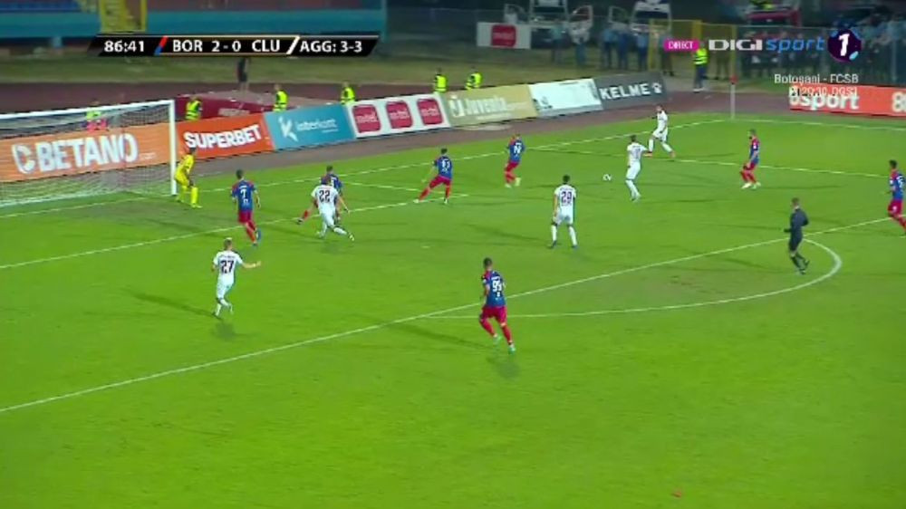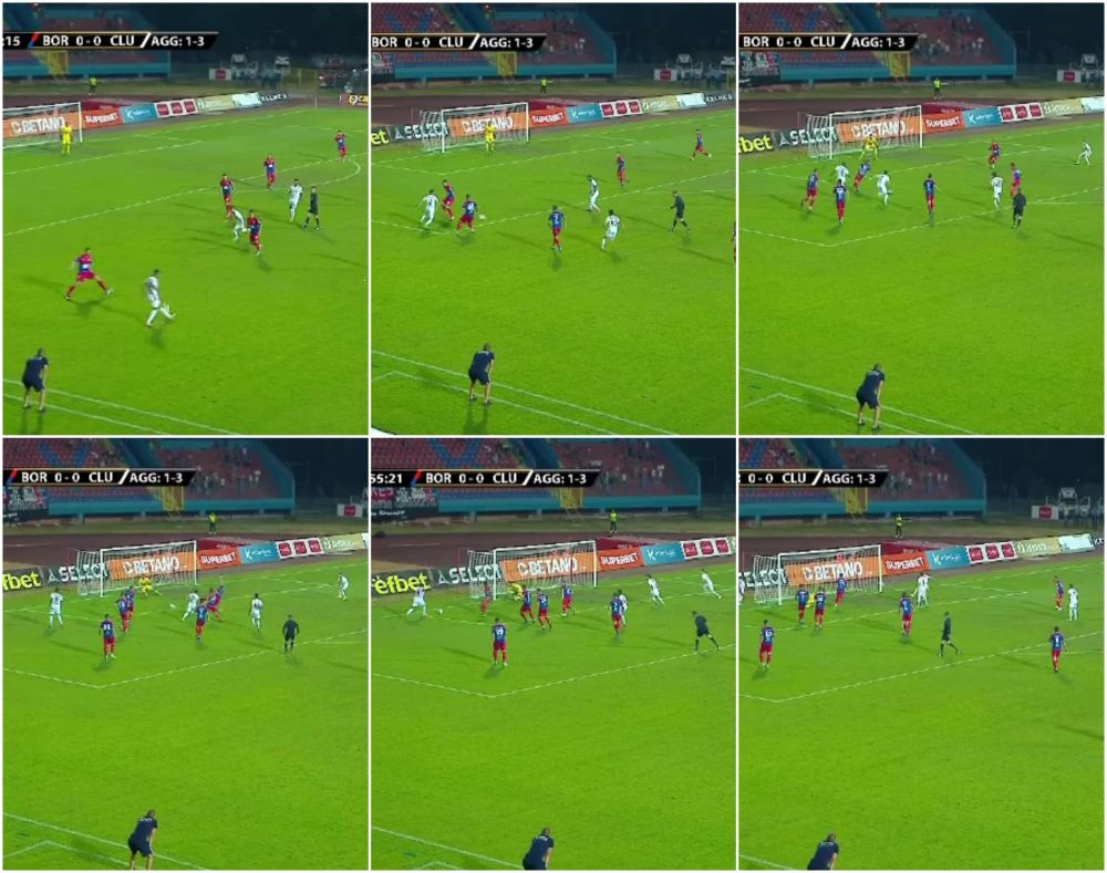 Min. 17: Ocazie importanta pentru CFR Cluj! Camora avanseaza in flancul stang si centreaza in fata portii. Costache se intinde dupa minge insa nu reuseste sa o atinga, iar balonul se scurge pe langa poarta celor de la Borac