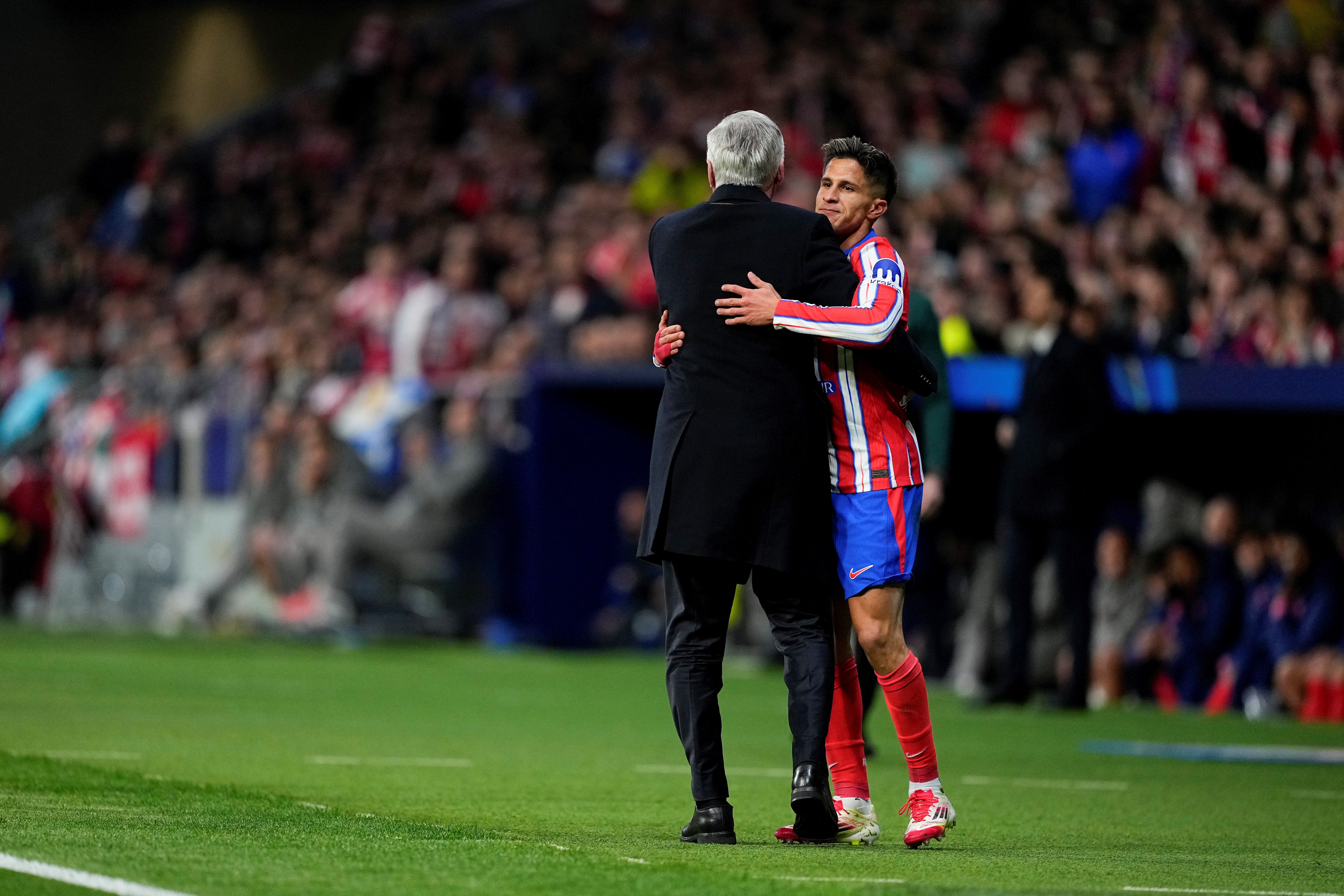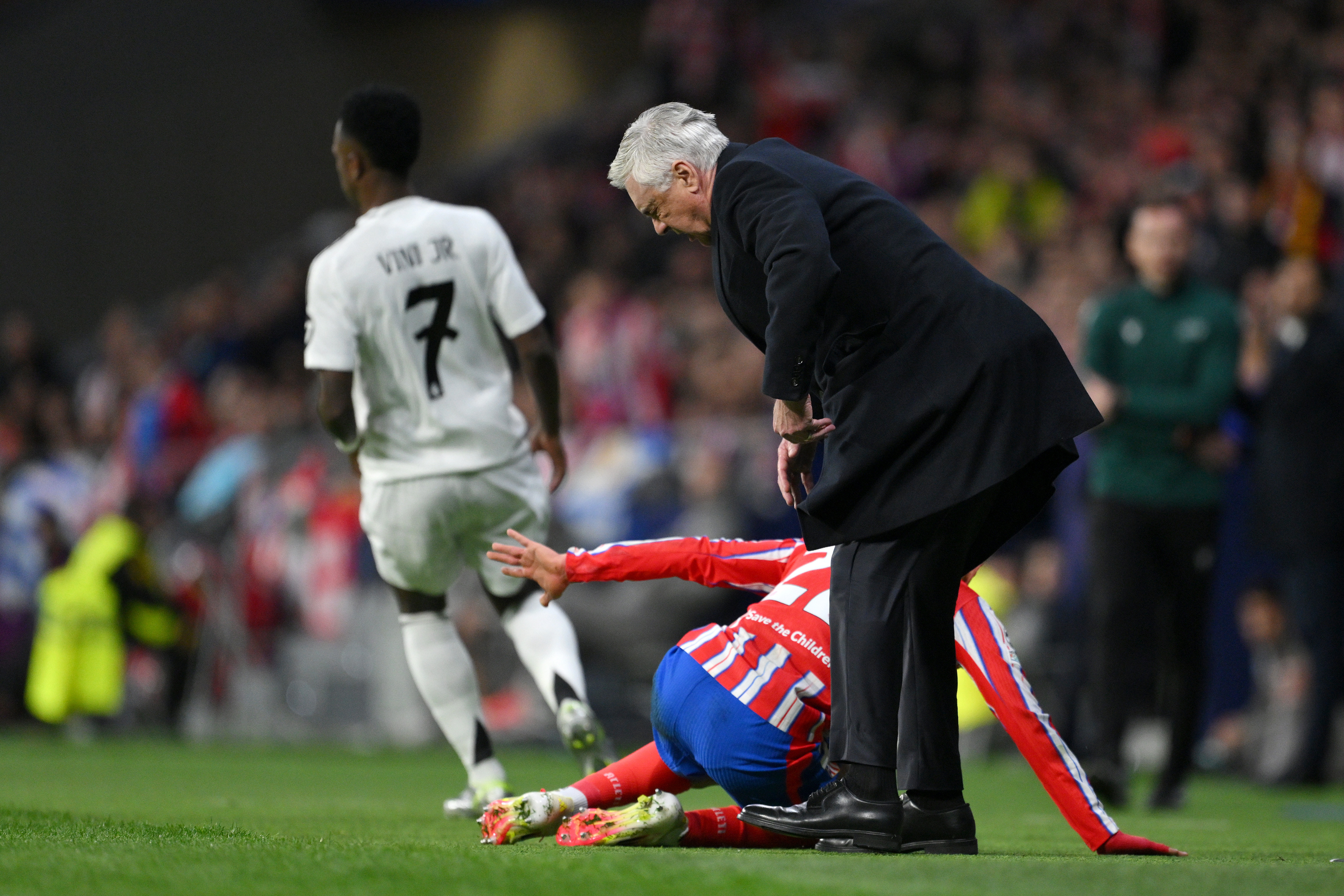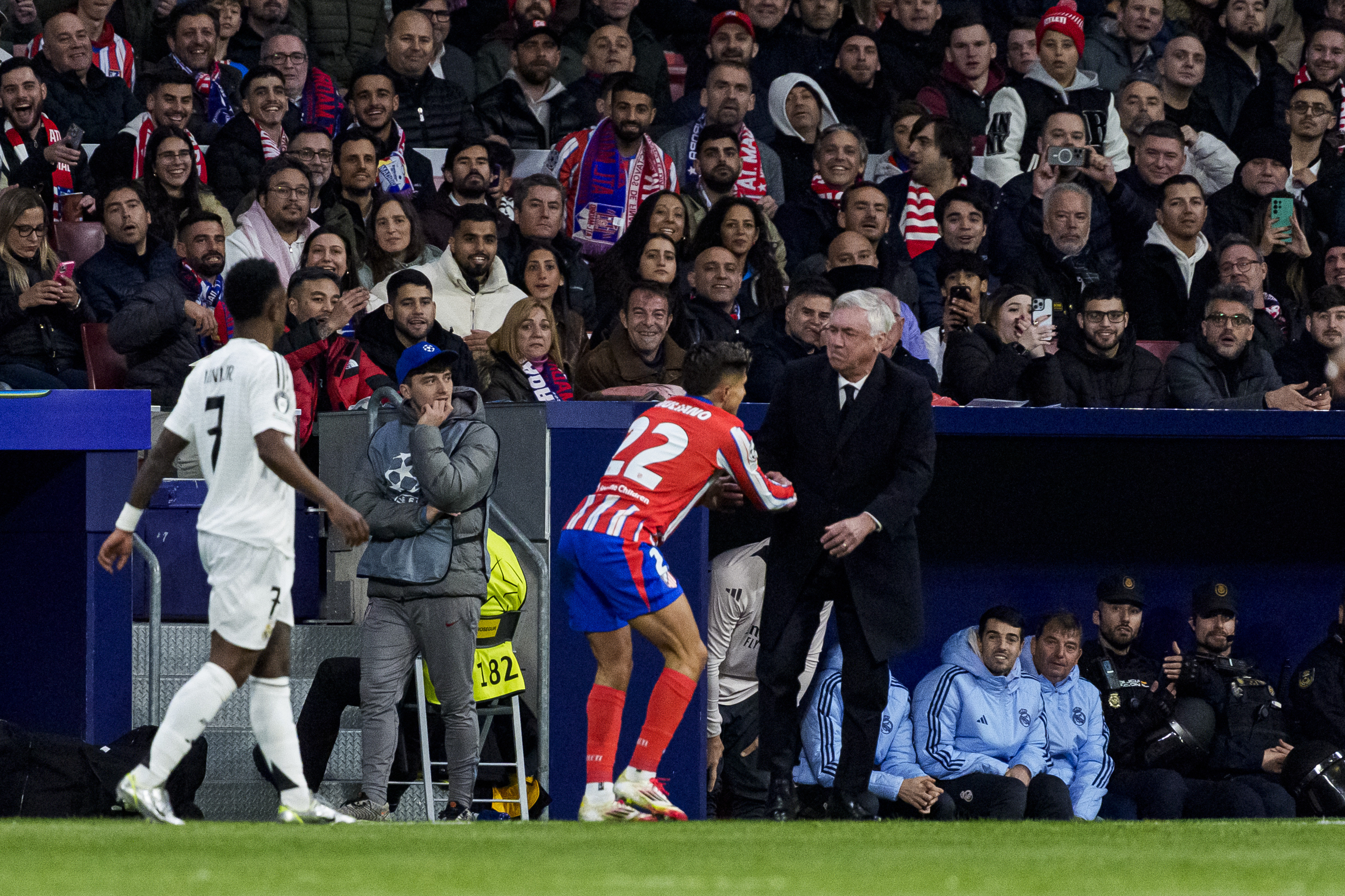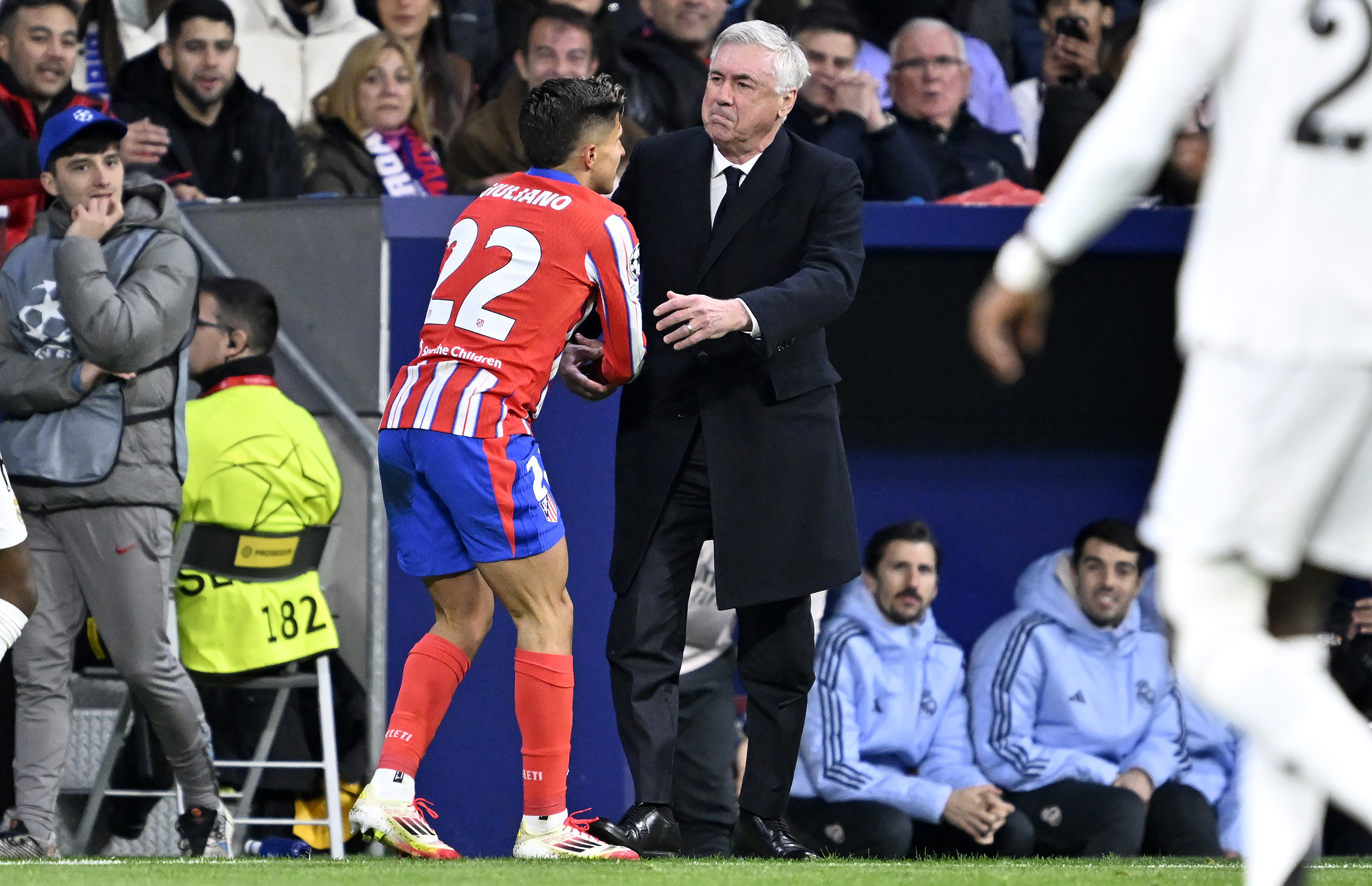 În minutul 12, Giuliano Simeone (22 de ani) a fost protagonistul unei faze inedite. Fiul antrenorului de la Atletico Madrid a alergat către marginea terenului pentru a evita un aut, a alunecat pentru a încerca să prindă mingea, însă s-a oprit la picioarele lui Carlo Ancelotti (65 de ani), lovindu-l ușor pe antrenorul lui Real Madrid.