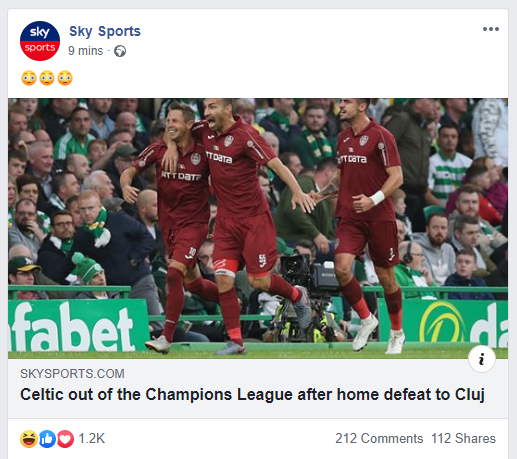 Sky Sports a publicat la scurt timp dupa fluierul de final stirea. "Celtic este out din Champions League dupa ce a fost invinsa acasa de Cluj", au notat jurnalistii britanici.