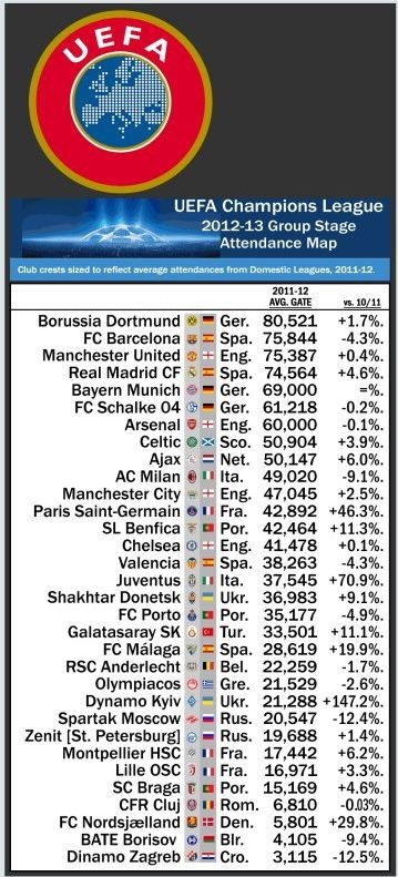 Cum in Liga "spectatori = bani", CFR cluj este una dintre cele mai proaste "afaceri" din Liga, clubul din Romania fiind la coada unei liste condusa, surprinzator, de Borussia Dortmund, echipa cu o medie fabuloasa, de peste 80.000 de oameni, urmata de Barcelona si Manchester United, cu putin peste 75.000 de spectatori.