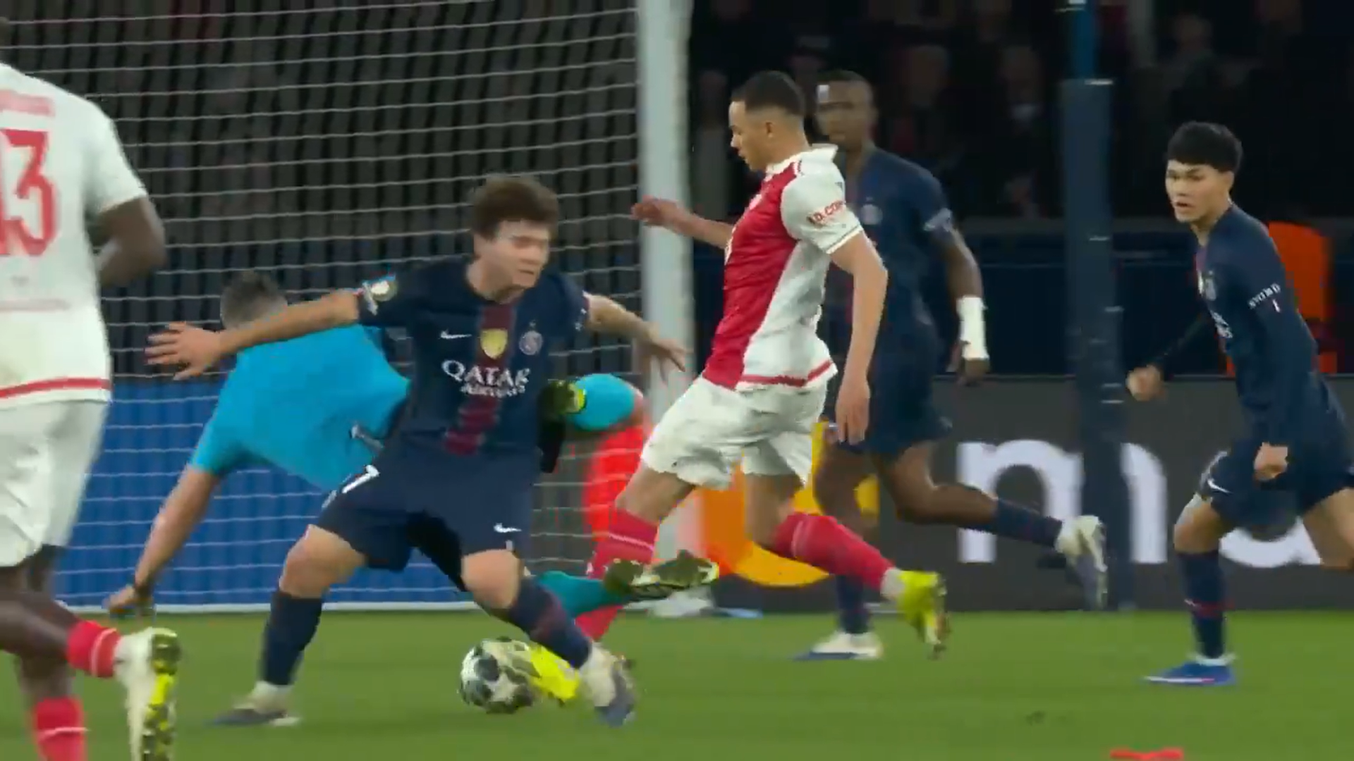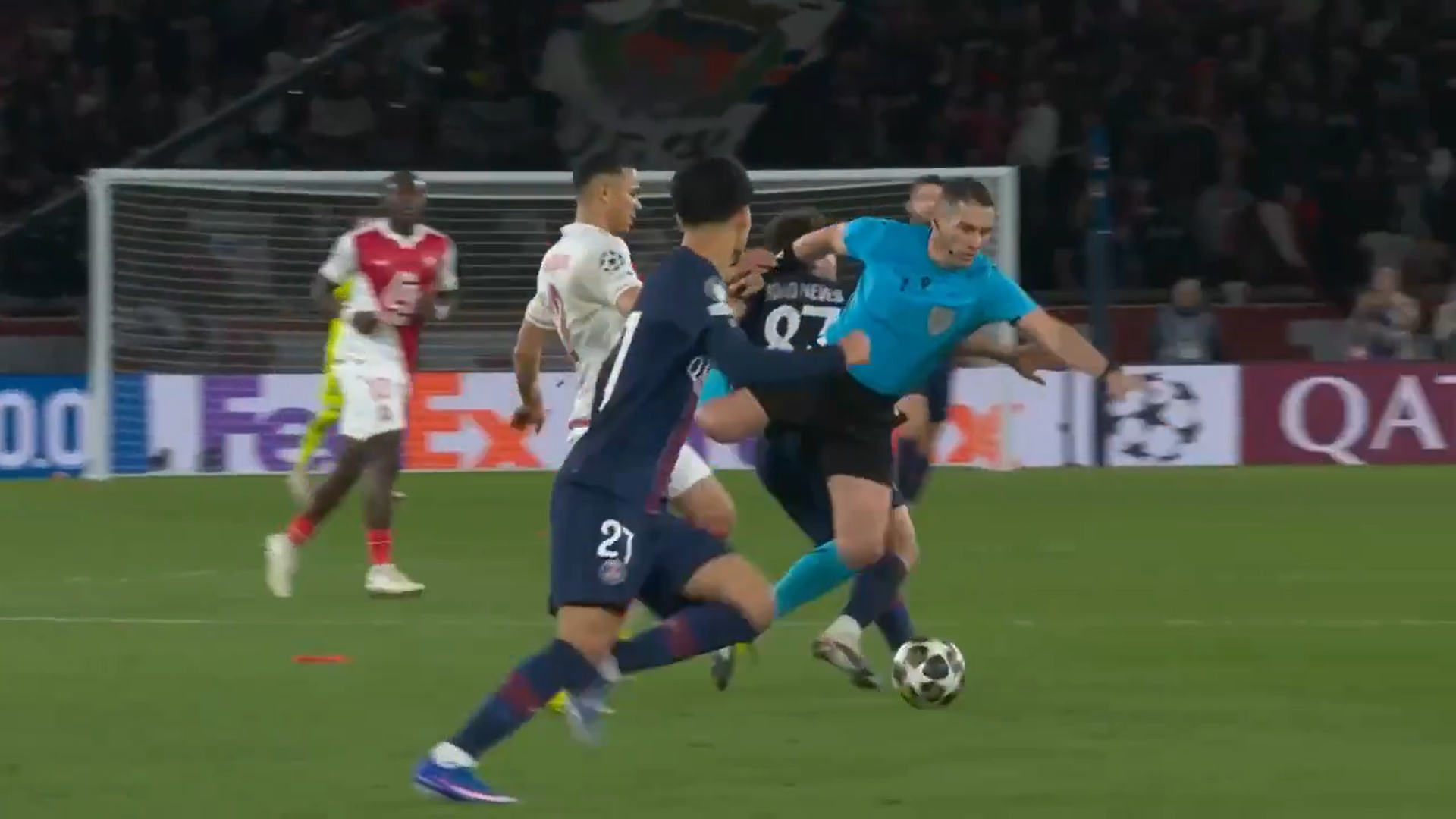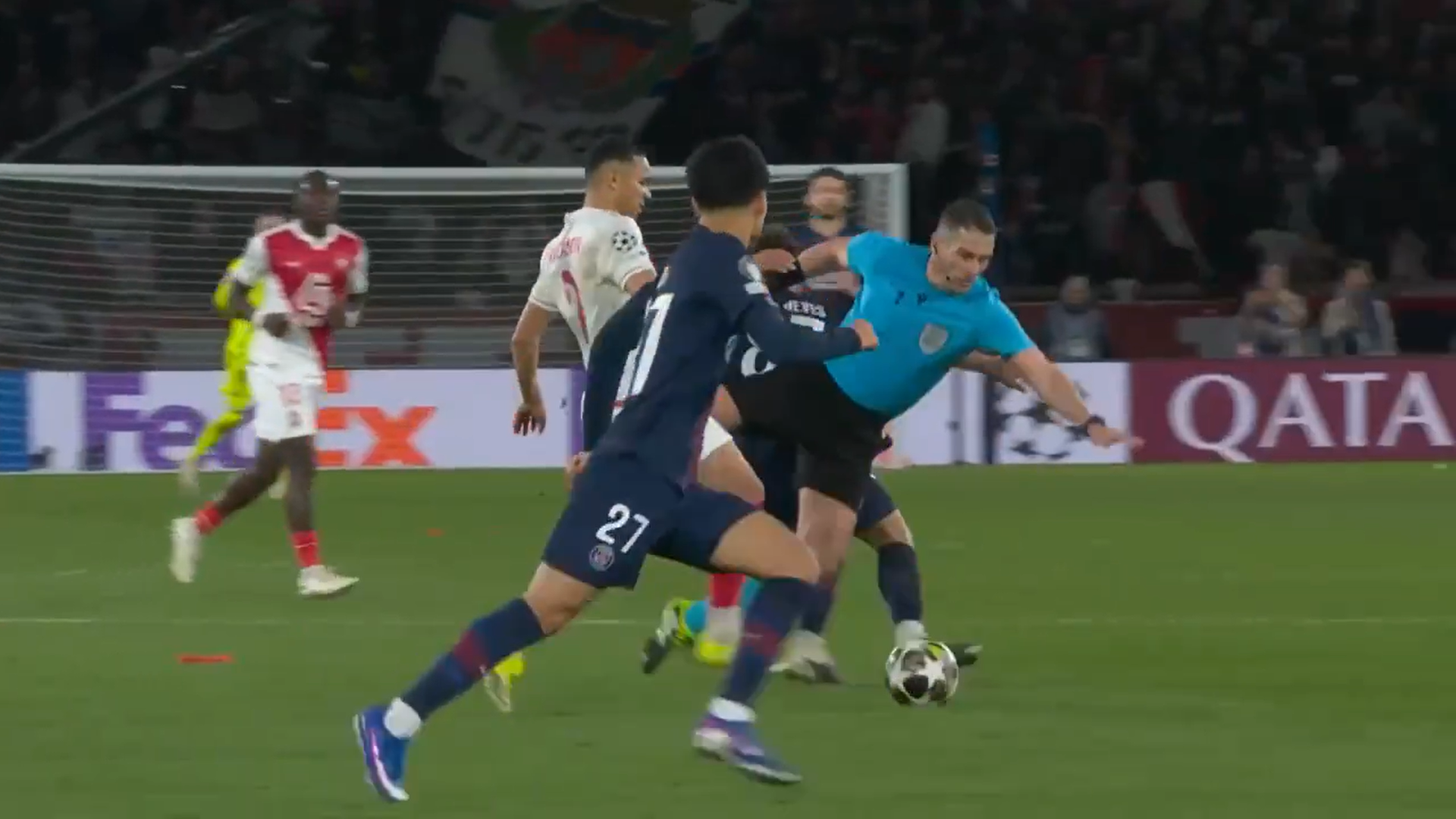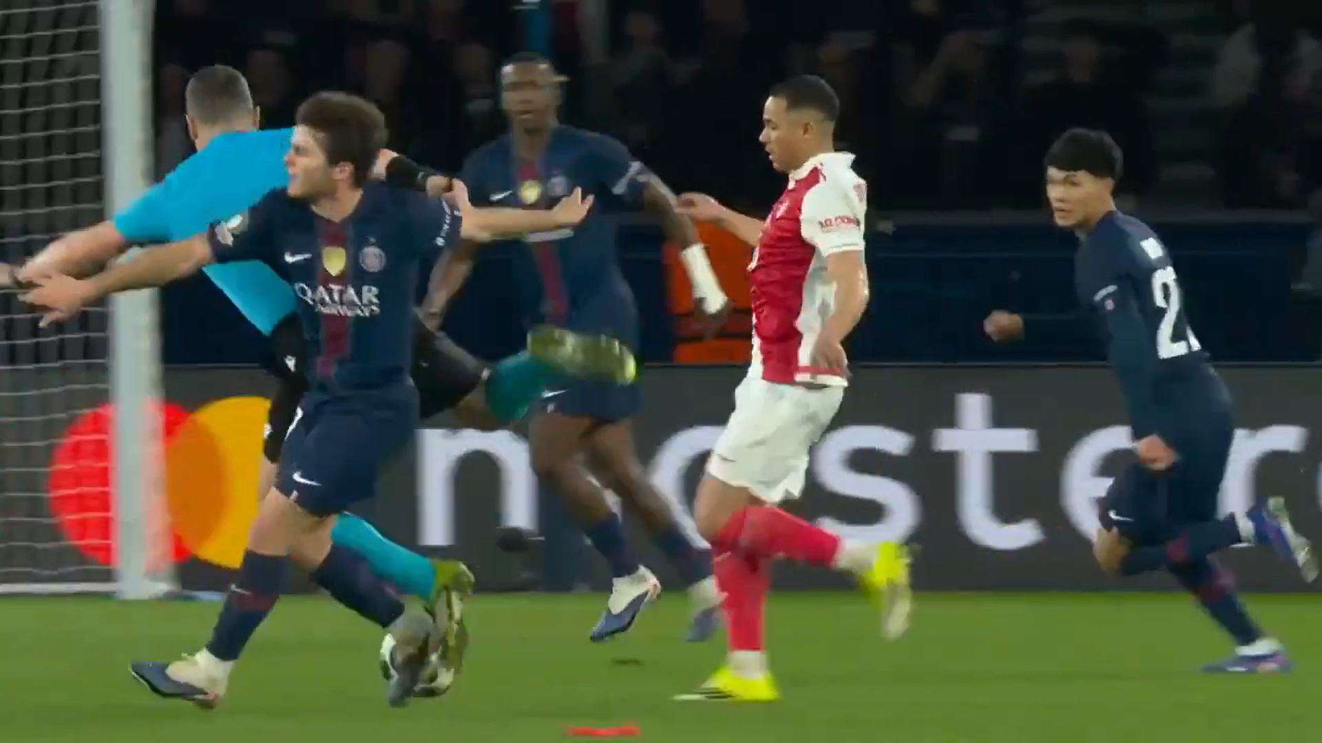 Momentul inedit la care a luat parte Istvan Kovacs a urmat imediat după. Arbitrul român urmărea o fază, dar nu a fost atent la Joao Neves, starul celor de la PSG, centralul s-a împiedicat și a plonjat ca în filme, în final prăbușindu-se pe gazon.