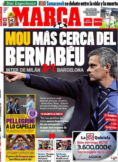 Spaniolii sunt de acord cu tehnicianul portughez si scriu ca golul lui Pedro este de aur si ii pot aduce Barcelonei calificarea in returul de pe Camp Nou. Inter i-a administrat Barcelonei cea mai dura infrangere cu Pep pe banca. Niciodata nu a mai primit Barcelona 3 goluri intr-un meci.