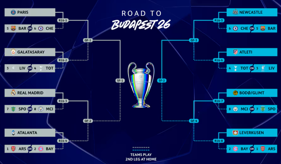 Atletico Madrid, Bodo/Glimt, Bayer Leverkusen, Newcastle, Atalanta, Real Madrid, Paris Saint-Germain, Galatasaray Istanbul