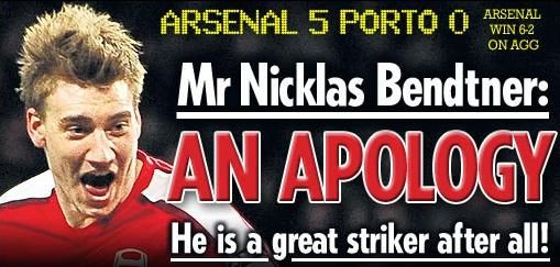 Eroul serii a fost danezul Nicklas Bendtner, care i-a facut pe jurnalistii de la The Sun sa-si ceara scuze public pentru ca s-au indoit de valoarea lui. Bendtner a reusit un hat-trick de poveste, insa golul serii a fost marcat de Samir Nasri.