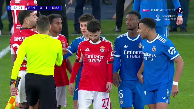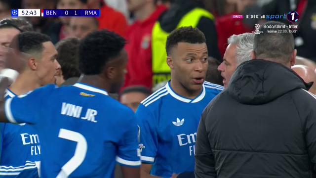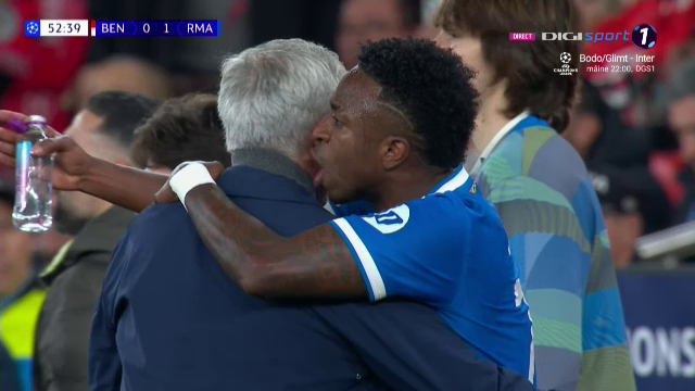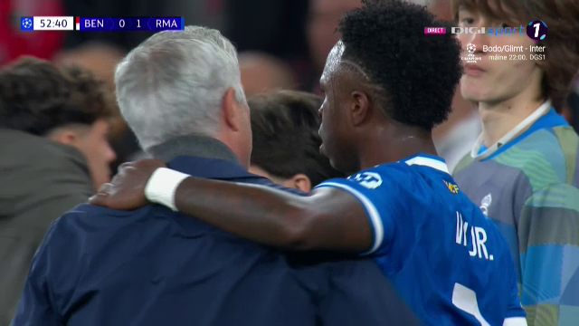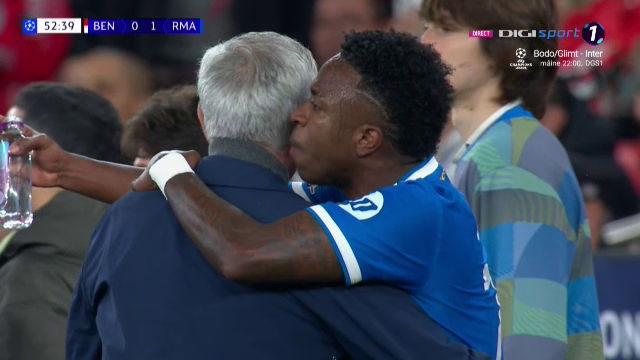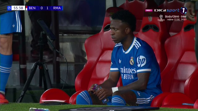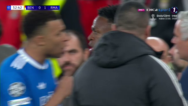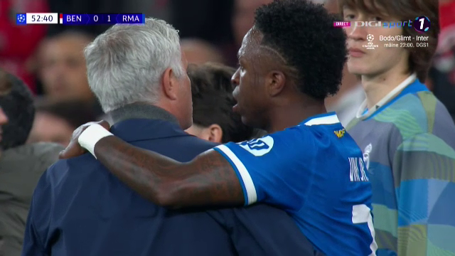 Vinicius a pretinde că a fost jignit de Prestianni și a mers la arbitru să îl informeze. Brazilianul a fost deranjat de felul în care a fost gestionat de centralul Letexier și s-a așezat pe bancă, transmițând astfel că nu mai vrea să joace până nu este eliminat atacantul lui Benfica.