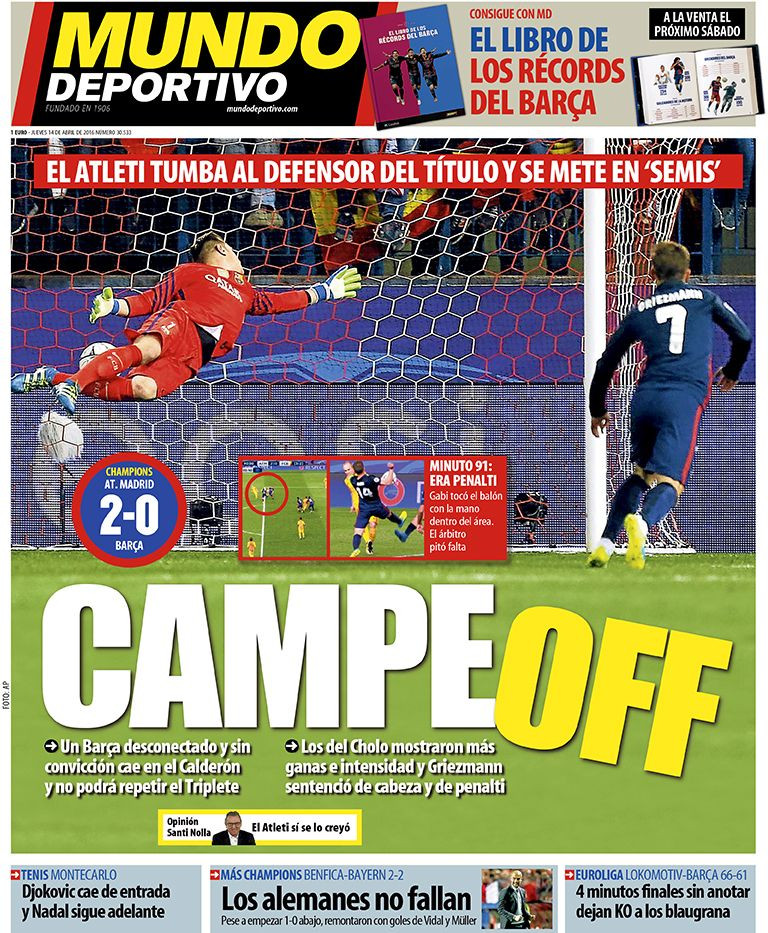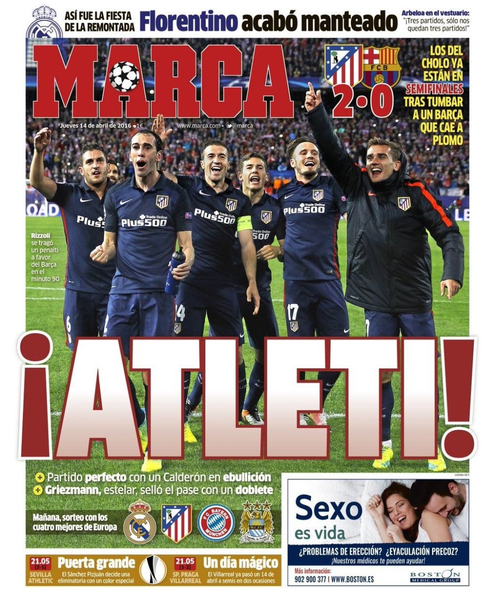 In schimb, ziaristii de la AS au scris pe prima pagina de astazi: "Indragostiti de Atleti", notand si erorile de arbitraj. Pe langa penaltyul neacordat Barcelonei, acestia sustin ca Suarez si Iniesta ar fi trebuit eliminati.