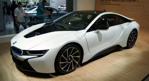 ►Iata si noul i8 Plug-In Hybrid, una din principalele atractii de la Frankfurt! Este o masina cu arhitectura din aluminiu, e construita din plastic intarit cu fibra de carbon, are un motor de 1.5 litri in 3 cilindri twin-turbo pe benzina ce scoate 228 de cai conectat la o cutie automata in sase trepte. Motorul electric are 129 de cai si e completat de o batrie din litiu-ion de 5kWh cu racire lichida. Noul BMW prinde suta in 4.4 secunde si are o viteza de top de 250 de km/h in conditiile in care consuma DOAR 2.5 l/100 km! i8 poate merge pana la 35km doar pe electricitate, insa viteza de top este limitata la 120 km/h.