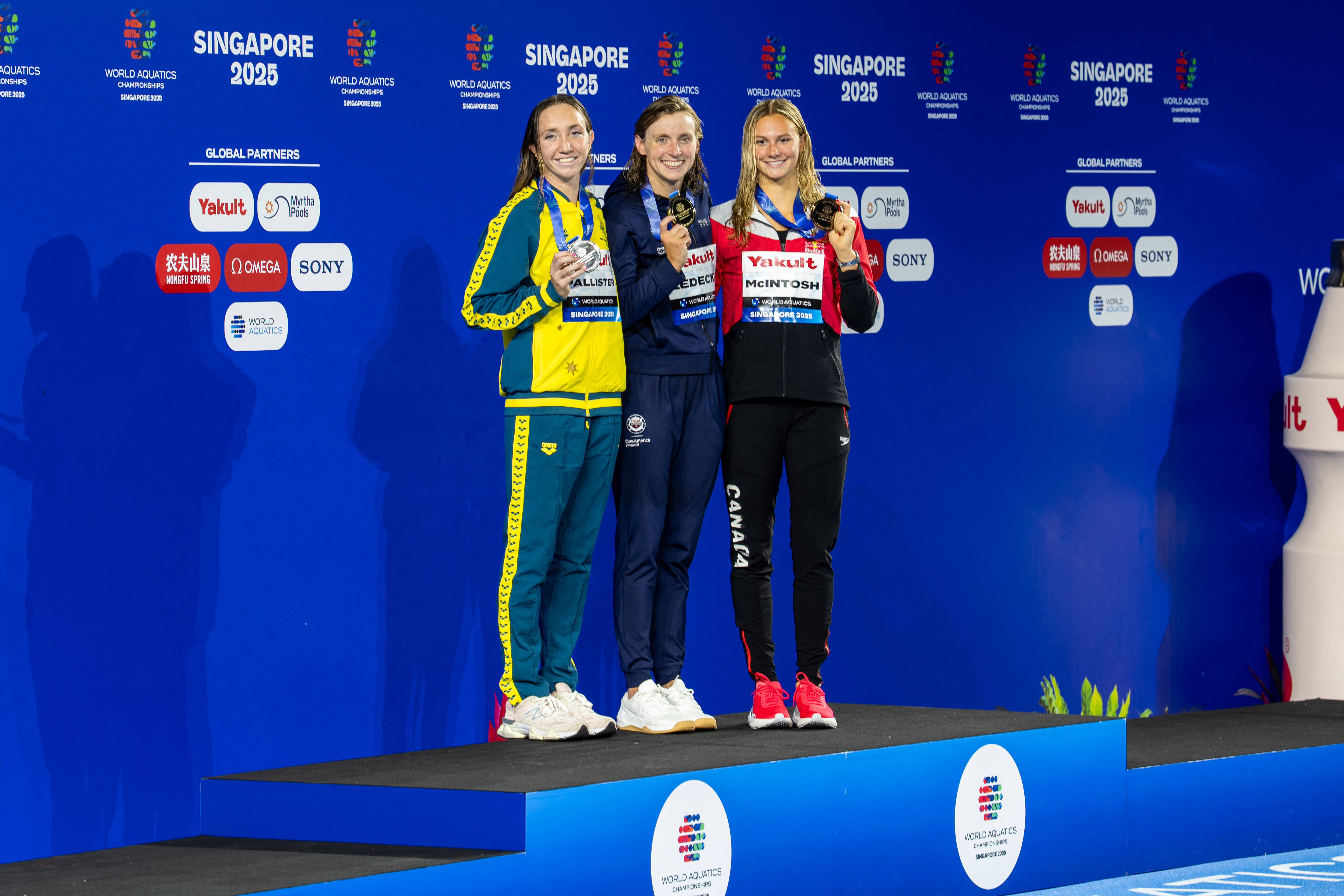 Americanca Katie Ledecky a câştigat titlul mondial la proba de 800 m liber pentru a şaptea oară în carieră, sâmbătă, la Campionatele Mondiale de Nataţie de la Singapore, după o luptă epică cu australianca Lani Pallister şi canadianca Summer McIntosh, scrie AFP.
