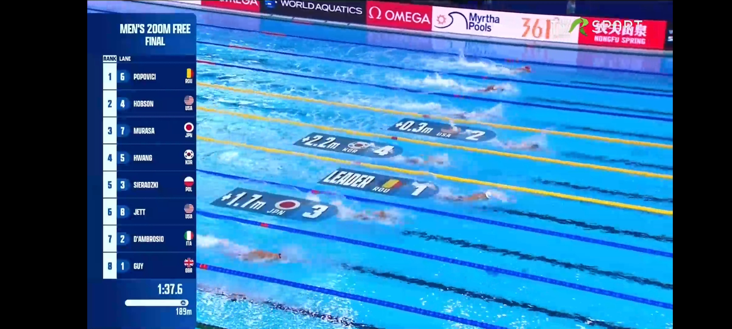 Încă o dată, în stilul său caracteristic, David a pornit în urma rivalilor săi în cursă, fiind inclusiv pe locul 4, la un moment dat. Apoi însă, într-o probă în care înotătorii scad ritmul, pe măsura ce se apropie finalul, Popovici a mărit viteza. Și a trecut pe locul 1, unde a și rămas, trecându-și în cont al 11-lea aur, la 200 de metri liber.