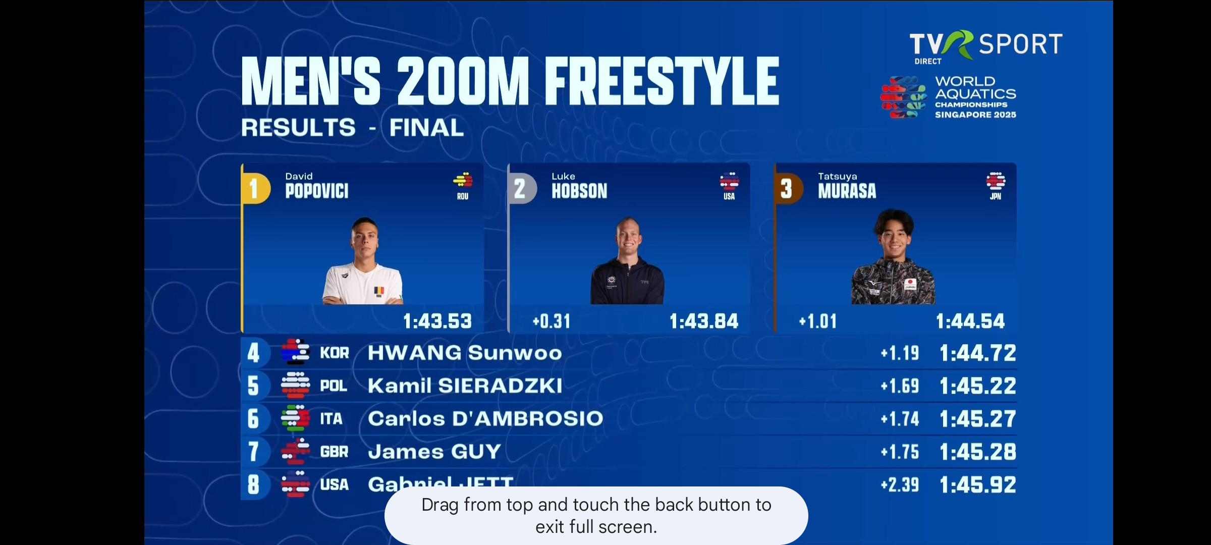 Într-o probă cu o concurență sufocantă, în care sutimile de secundă fac diferența, David a pornit de pe culoarul 6. Și, ca de obicei, românul a făcut o cursă minunată, câștigată de această dată cu timpul de 01:43.53!