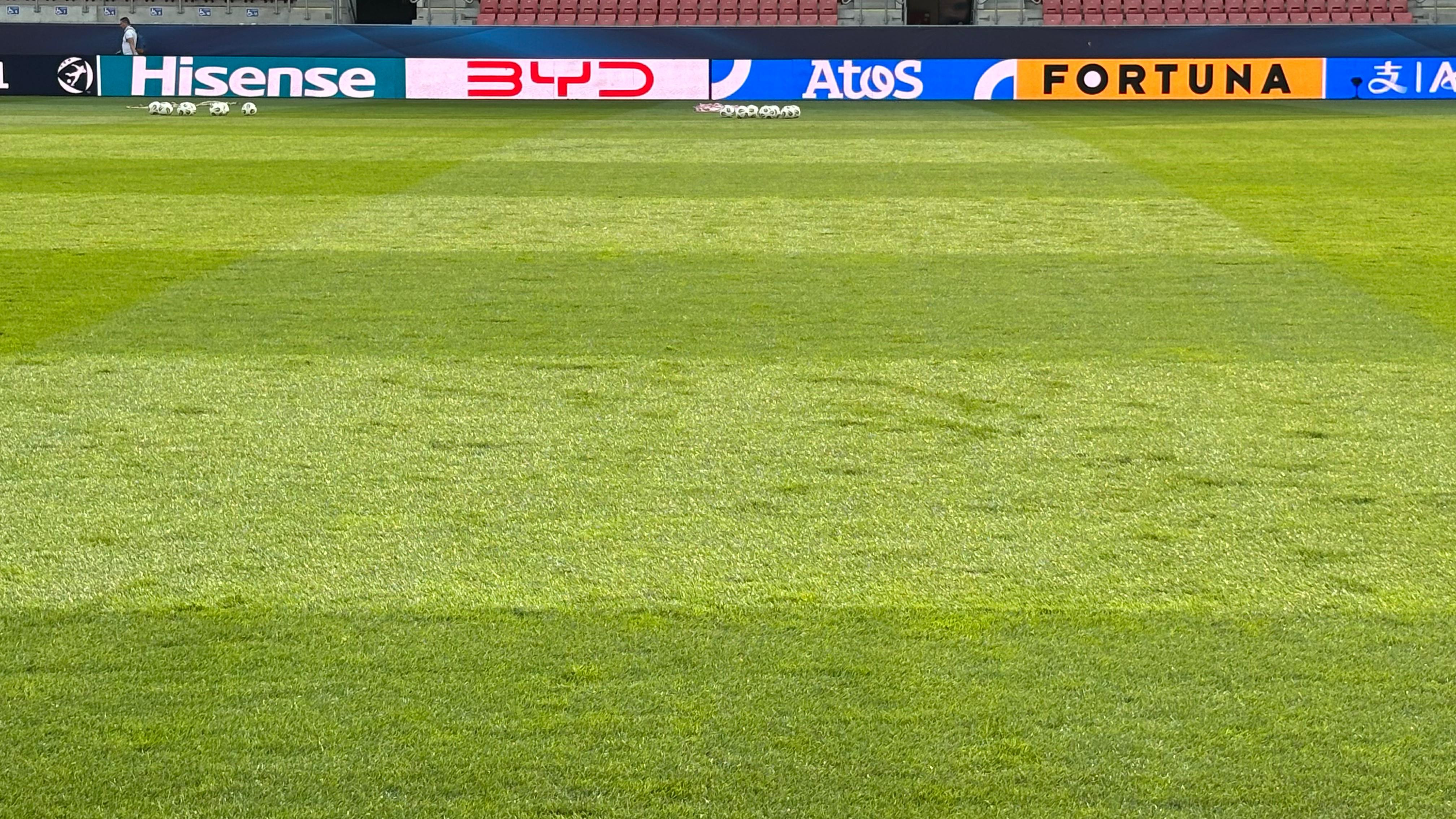 Gazonul arenei este hibrid. Include atât iarbă naturală, cât și artificială. În clipa de față, e cam uscat, lucru de care s-a plâns și selecționerul, care a cerut mai multă apă.