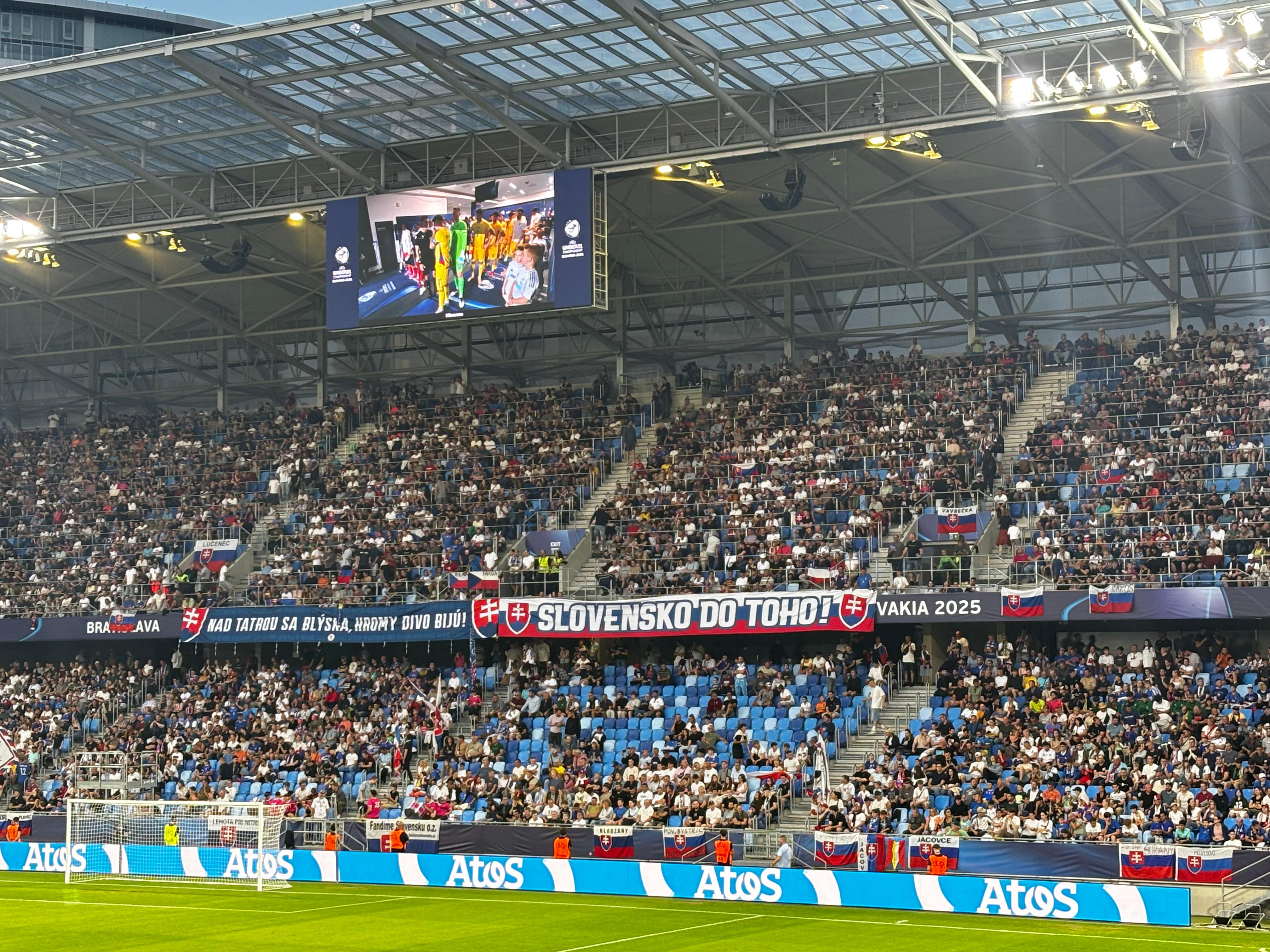 Pe arena ”Tehelné pole”, cu o capacitate de 22.500 de locuri, România va întâlni țara gazdă și va avea parte de o asistență impresionantă. Cu câteva minute înainte de startul partidei, tribunele erau aproape pline. Potrivit cifrelor oficiale, sunt prezenți 16.408 spectatori.