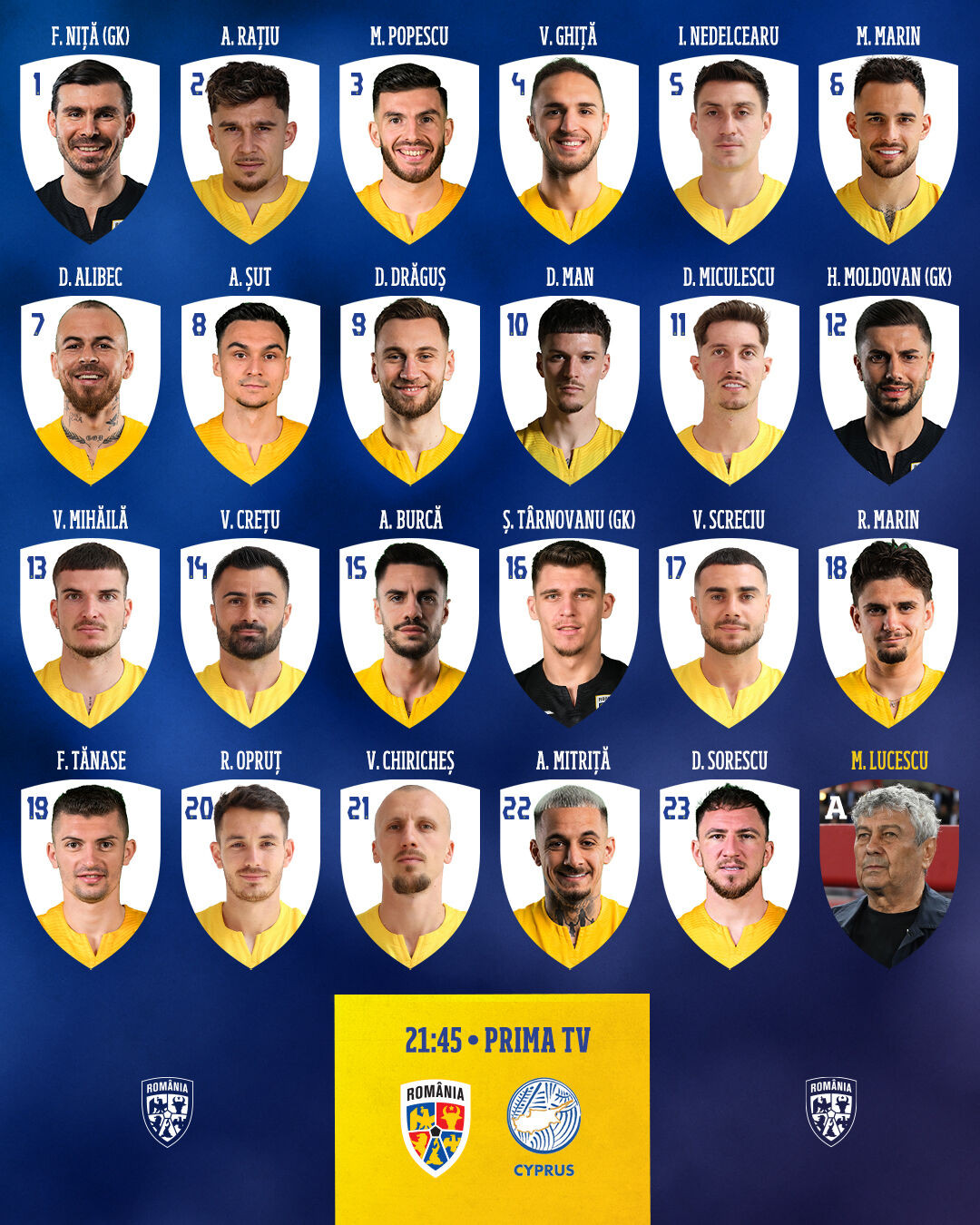 Selecționerul Mircea Lucescu a ales lotul de 23 de jucători pentru meciul de astăzi al României cu Cipru, de la ora 21:45 pe Arena Națională în preliminariile Campionatului Mondial din 2026.