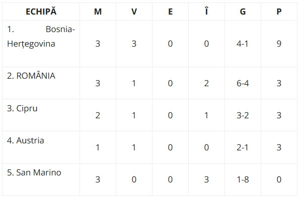 Vineri, 21 martie: Cipru – San Marino 2-0 (Pittas 55′, Kakoulli 86′), ROMÂNIA– Bosnia și Herțegovina 0-1 (Gigović 14′)