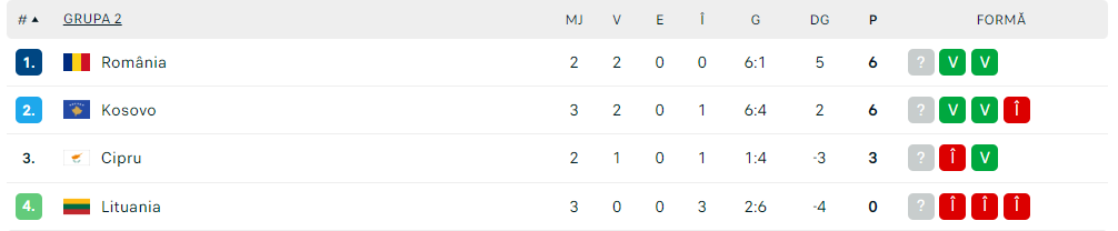 Kosovo s-a impus cu 2-1 şi se află pe locul secund în grupa C2, având 6 puncte. Pe primul loc este, în continuare, România, cu şase puncte şi golaveraj mai bun. Cipru ocupă locul al treilea, cu 3 puncte, iar Lituania are trei înfrângeri din trei meciuri.