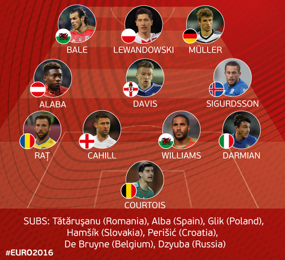 Thibaut Courtois (Belgia) - Matteo Darmian (Italia), Ashley Williams (Tara Galilor), Gary Cahill (Anglia), Razvan Rat (Romania) - Gylfi Sigurdsson (Islanda), Steven Davis (Irlanda de Nord), David Alaba (Austria) - Thomas Muller (Germania), Robert Lewandowski (Polonia), Gareth Bale (Tara Galilor)