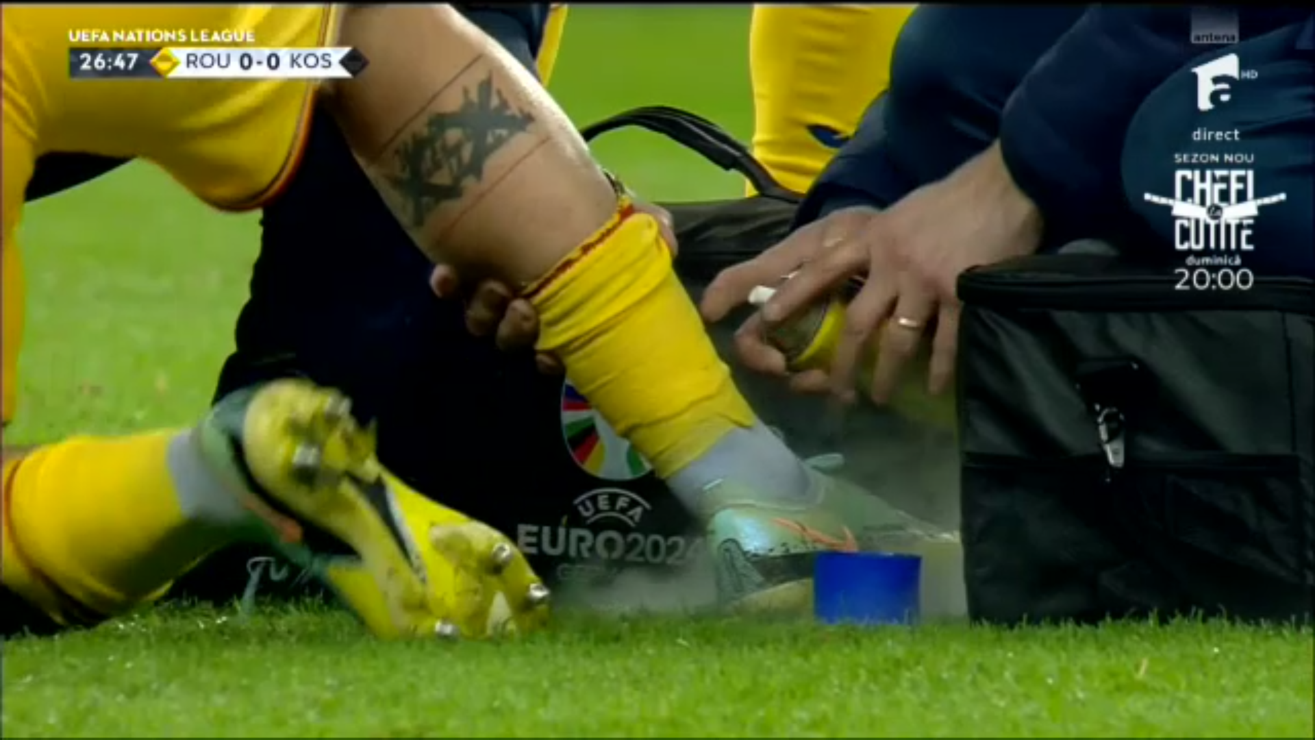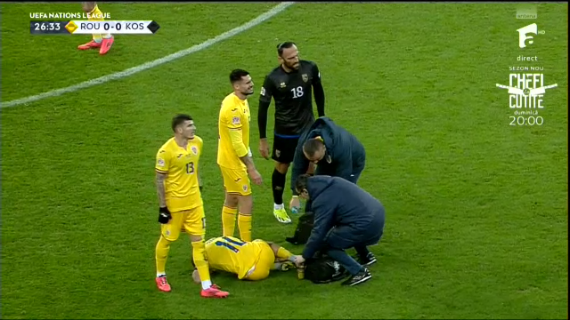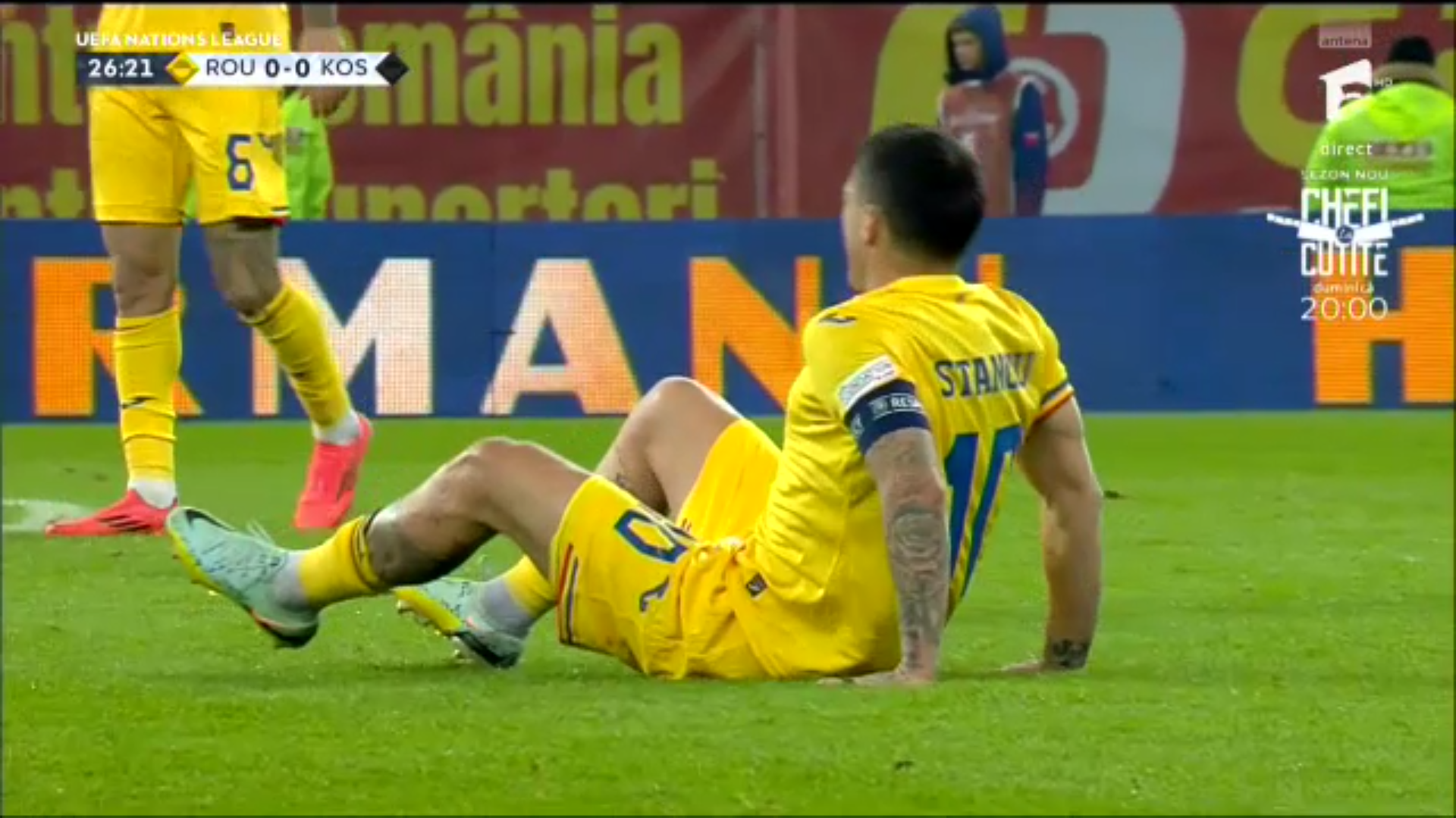 În minutul 27, Nicolae Stanciu a fost călcat involuntar de către atacantul Vedat Muriqi. Căpitanul echipei naționale a alergat câțiva pași, însă s-a așezat pe gazon de durere și a cerut intervenția echipei medicale.