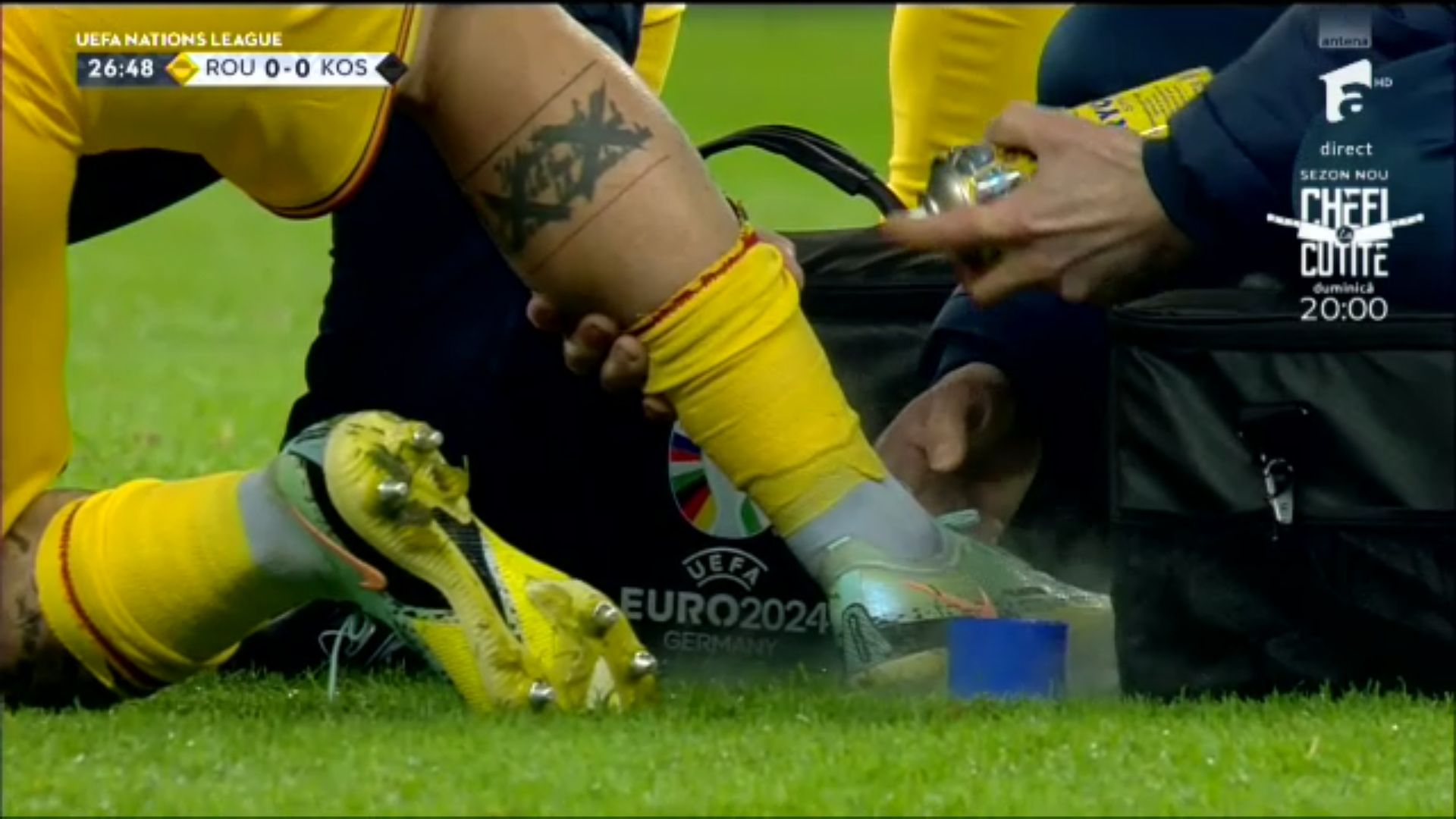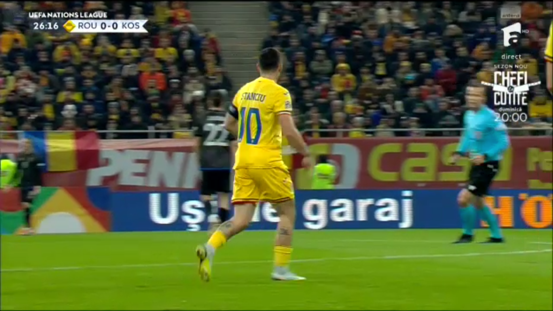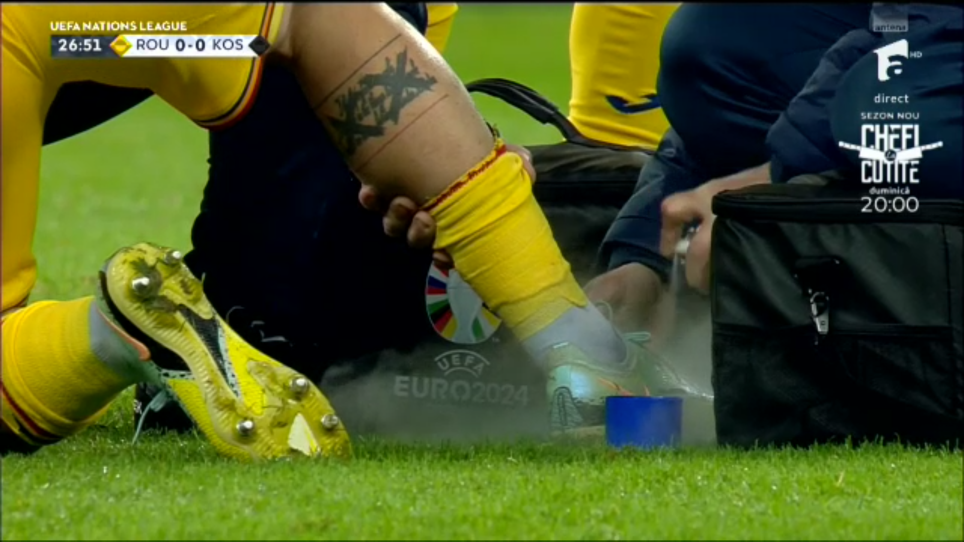 În minutul 27, Nicolae Stanciu a fost călcat involuntar de către atacantul Vedat Muriqi. Căpitanul echipei naționale a alergat câțiva pași, însă s-a așezat pe gazon de durere și a cerut intervenția echipei medicale.
