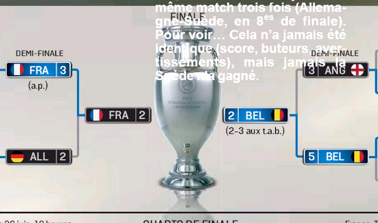 Finala? Ultimul act ar aduce un meci al nationalelor francofone. Belgia s-a confruntat in simularea L'Equipe cu Franta, castigand cu 3-2 dupa prelungiri.