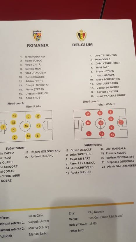 Min 30 - Belgienii au fost aproape sa-si creeze o faza periculoasa. In urma unei incursiuni in flancul drept, mingea a fost trimisa in careu, iar atacantul central al Belgiei a vrut sa paseze mai departe cu calcaiul, iar Nedelcu a interceptat mingea.
