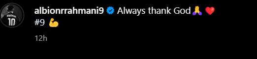 Într-una dintre imagini, Rrahmani apare cu mâna la inimă, în timpul intonării imnului național. Fotbalistul a scris doar trei cuvinte: „Always thank God!” (n.r. „Întotdeauna îi mulțumesc lui Dumnezeu”).