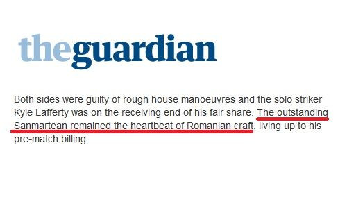 "Sanmartean a fost exceptional! A fost inima din jocul Romaniei", au scris jurnalistii de la Guardian.