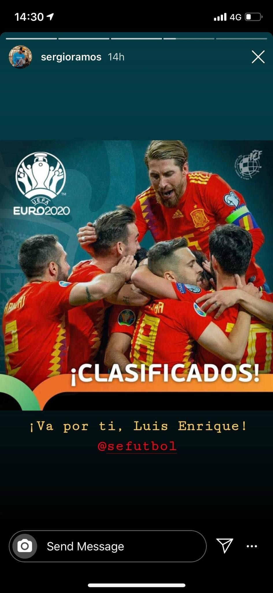 Imediat dupa finalul partidei, Sergio Ramos a postat pe contul oficial de Instagram, o poza in care apare alaturi de coechipierii sai de la nationala prin care a anuntat calificarea la Campionatul European din 2020. Sub poza, Ramos a avut un mesaj pentru fostul selectioner: "Asta este pentru tine, Luis Enrique!".