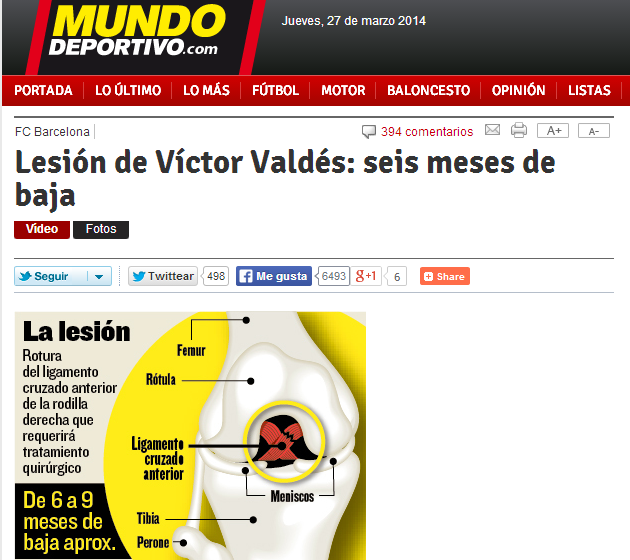 Si cei de la Mundo Deportivo anunta ca Valdes va sta sase luni si arata exact o schema a genunchiului sau.
