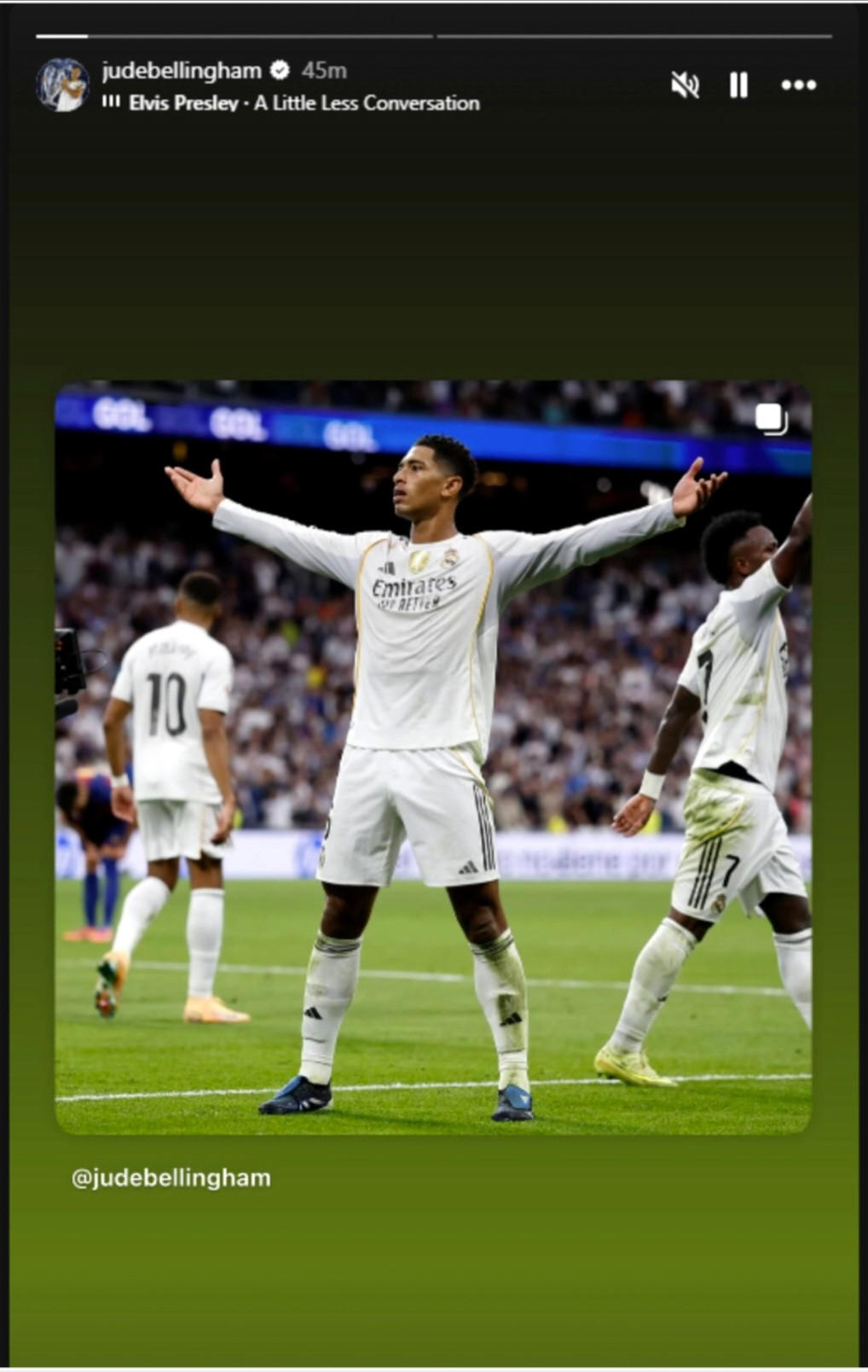La scurt timp după El Clasico, englezul a avut o postare cu celebra melodie a lui Elvis Presley, „Little Less Conversation“. Bellingham a pus această capodoperă muzicală la fotografia sa de după marcarea golului, trimiterea fiind clară. „Să dați mai puțin din gură“, le-a transmis Bellingham rivalilor de la Barcelona, aluzie la conflictele de pe teren și la protestele catalanilor la mai multe decizii ale arbitrului.