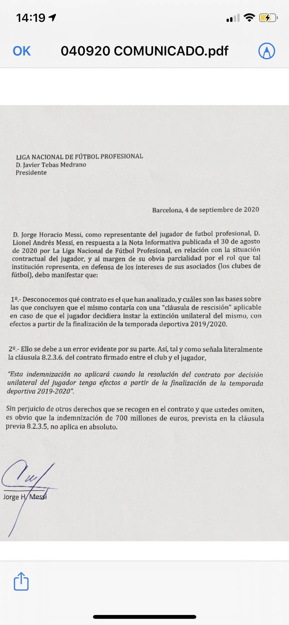 Tatal lui Messi a emis un comunicat in care raspundea la comunicatul emis de La Liga in care oficialii sustineau ca Leo Messi nu poate pleca fara sa ii fie achitata clauza de 700 de milioane de euro. Din comunicatul lui Jorge Messi reiese ca odata cu finalul sezonului 2019/2020, Leo Messi poate pleca pe gratis de la Barcelona.