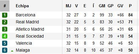 In Primera, Valencia si Malaga sunt pe locurile 5, respectiv 6, pozitii care duc in Europa League. Cum Sociedad este la doar 1 punct de Valencia, pe ultimul loc care duce in Liga Campionilor, cursa va fi stransa.