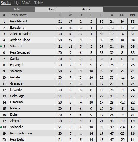Real Madrid este pe primul loc in Primera Division, dupa victoria cu 2-0 de pe teren propriu cu Granda. Ronaldo si Benzema au marcat golurile pentru galactici. Barcelona si Atletico Madrid joaca maine, cu Malaga, respectiv Rayo.