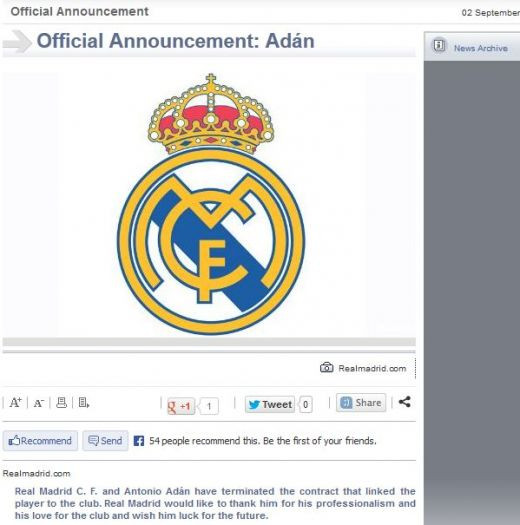 "Real Madrid CF si Antonio Adan au incheiat contractul care il lega pe jucator de club. Real Madrid doreste sa-i multumeasca pentru profesionalism si pentru iubirea pentru acest club si ii dorim tot binele in viitor" a sunat comunicatul oficial