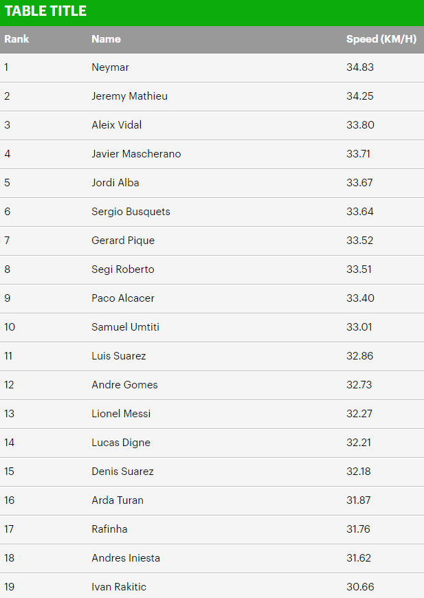 Brazilianul Neymar a atins o viteza-record de 34,83 km/h in timpul partidei cu Sporting Gijon. Cel mai lent jucator din lotul catalan este croatul Ivan Rakitic, cu un maxim de 30,66 km/h.