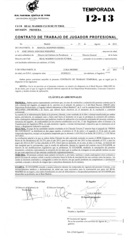 Football Leaks a obtinut documentele primului contract semnat de Modric cu Real Madrid, in 2012, dezvaluind ca acesta jucatorul cu a doua clauza de reziliere din lume, dupa Ronaldo.