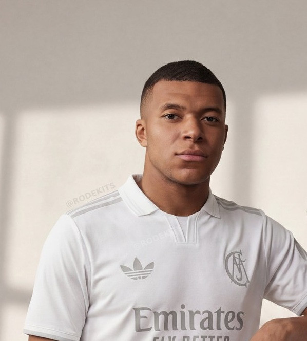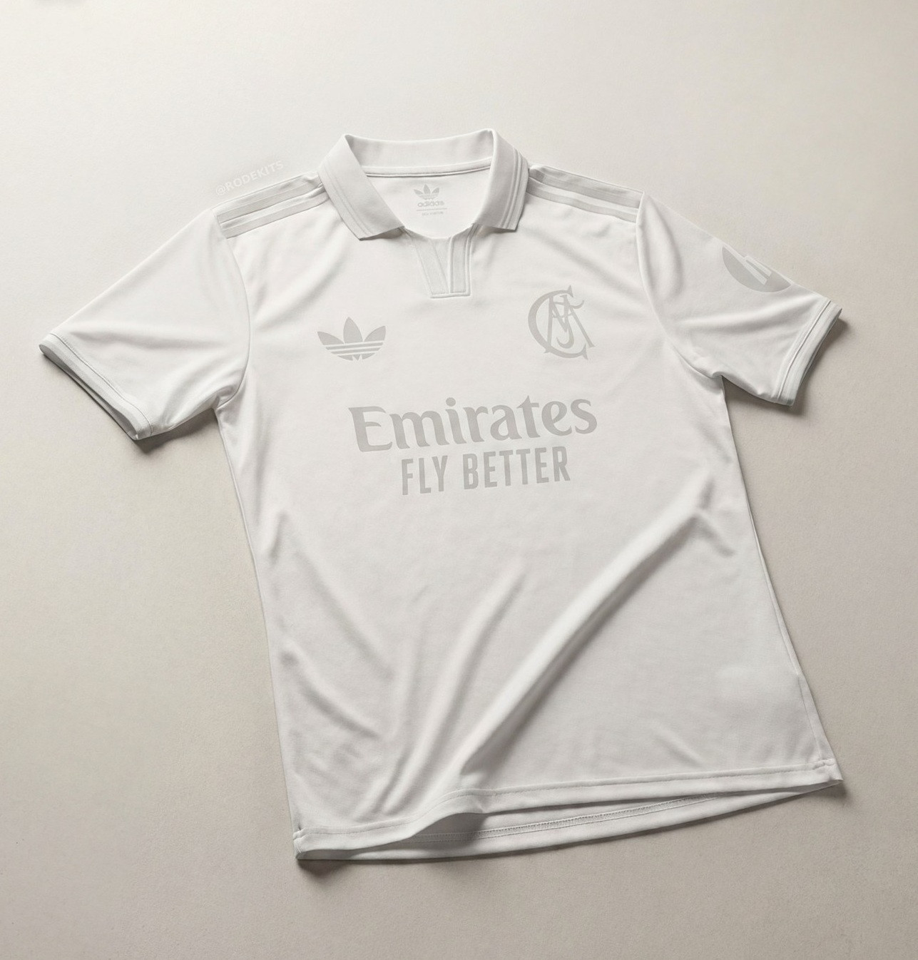 Pentru o aniversare atât de specială, Real Madrid propune un echipament alb, așa cum a obișnuit în toți acești ani, însă de această dată, toate detaliile, vor fi colorate într-un gri foarte deschis.