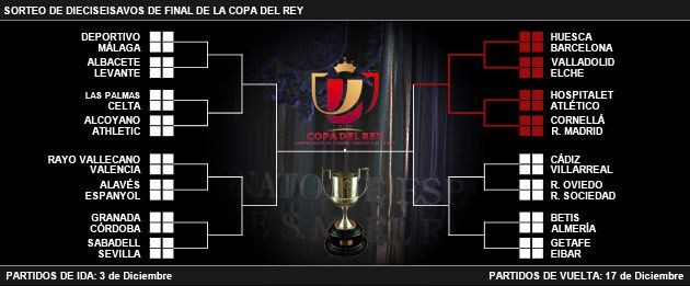 Astazi s-au tras la sorti meciurile din saisprezecimile Cupei Regelui Spaniei, faza in care echipele din La Liga se intalnesc cu cele din Segunda. Barcelona joaca cu Huesca, Atletico Madrid cu Hospitalet iar Real Madrid merge la Cornella.