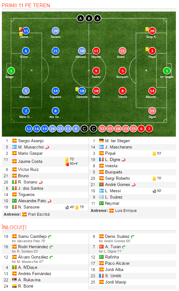 Golurile partidei au fost inscrise de Sansone, din pasa lui Pato, in minutul 50, respectiv Leo Messi, in minutul 90. De la gazde, Jaume Costa a fost eliminat pe final, in minutul 90+4.