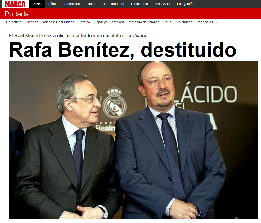 "Sefii clubului Real Madrid s-au reunit de urgenta luni si au decis inlocuirea lui Rafa Benitez cu Zinedine Zidane din aceasta aseara", scrie Marca, cel mai important site de sport din Spania.