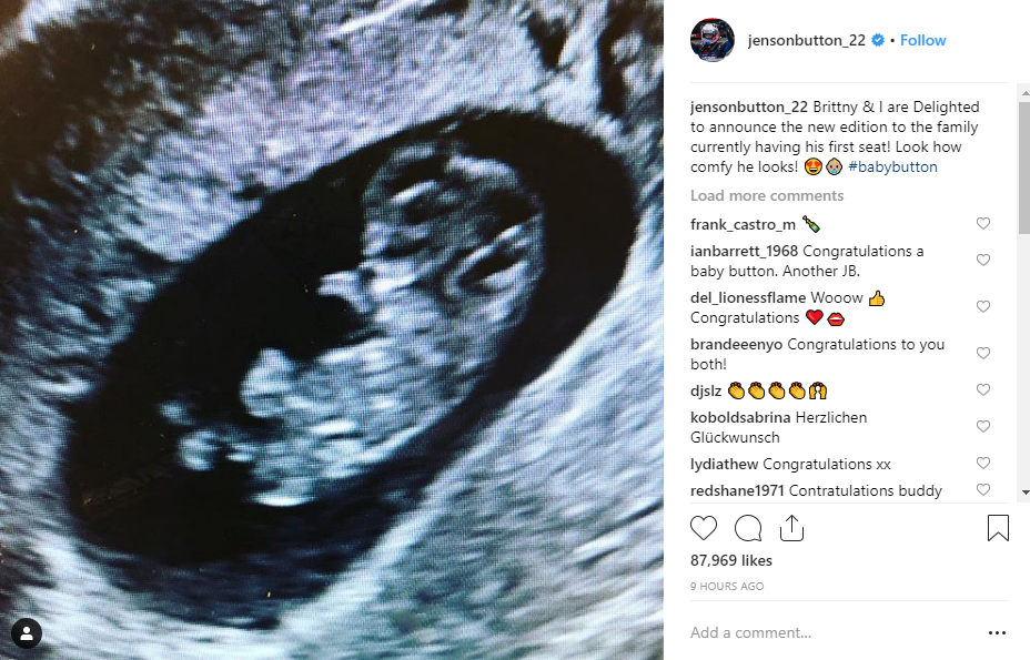 Fostul pilot din Formula 1, Jenson Button a anuntat ca logodnica sa, Brittny Ward, ii va oferi primul copil. Brittny a fost model Playboy, iar acum a impartasit vestea cu fanii sai de pe Instagram. Nici pilotul nu a tinut ascunsa marea veste si a facut public anuntul.