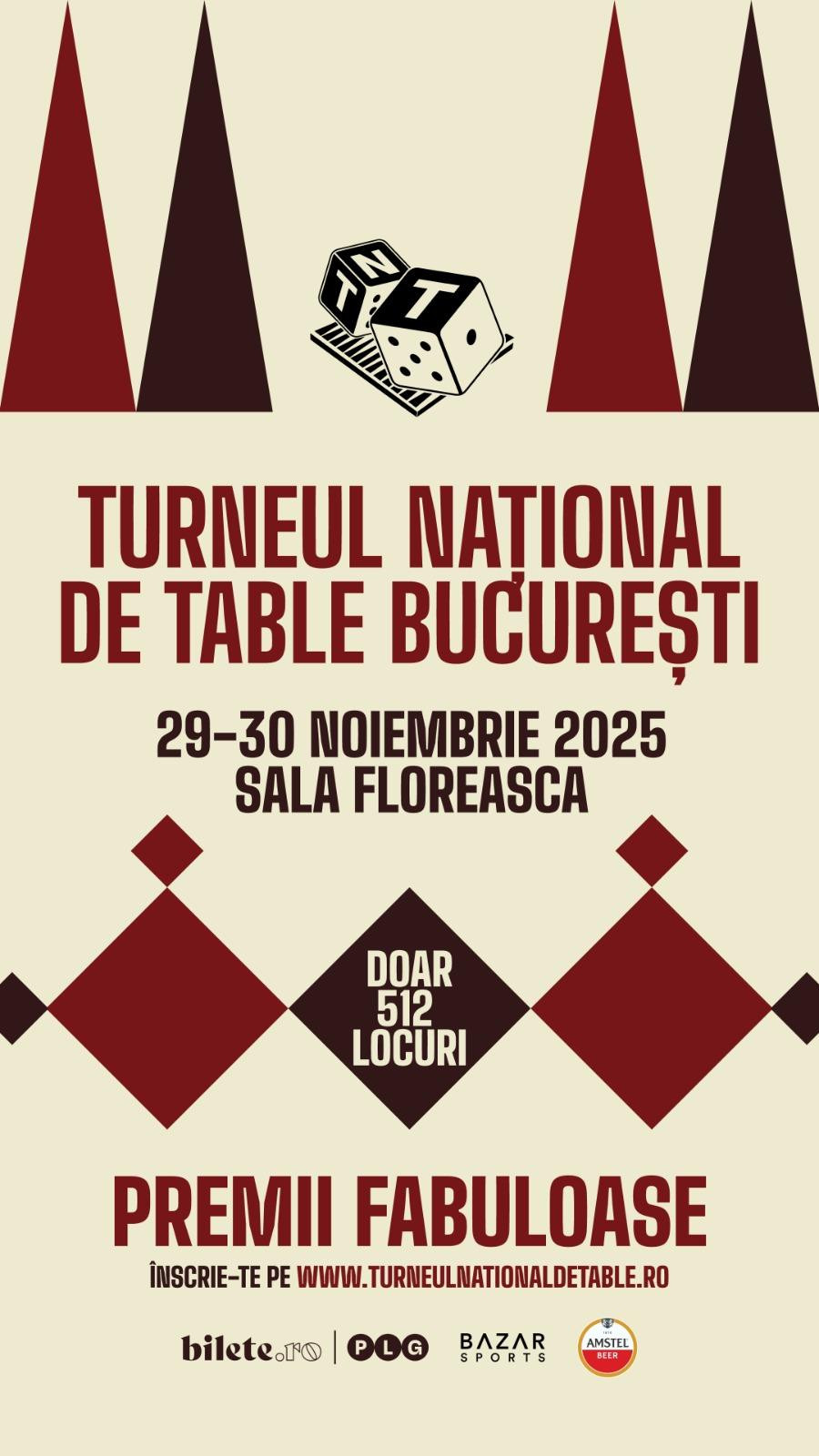Sala Floreasca va găzdui, pe 29 și pe 30 noiembrie, prima ediție a Turneului Național de Table București. Organizatorii au gândit un format cu 512 participanți, care se vor înfrunta în fazele preliminarii, semifinale, finala mică și finala mare. Câștigătorul va primi un Logan, iar finalistul va merge în vacanță în Turcia.