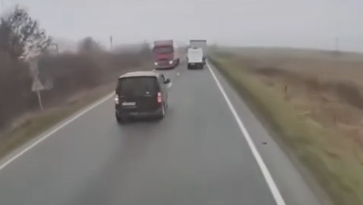 Imaginile surprinse de o cameră de bord arată că șoferul a încercat o depășire, moment în care a intrat în coliziune frontală cu o autocisternă care circula regulamentar.