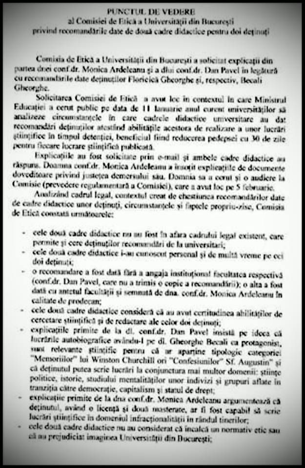 (...) Comisia de Etica apreciaza explicatiile oferite, chiar daca de nivel diferit, ca fiind nesatisfacatoare, putin atente la dimensiunea etica a intregului contect si recomanta Universitatii din Bucuresti sa avertizeze - in sensul Cartei UB si a Codului de Etica - cadrele didactice care au dat sau vor sa dea recomandari detinutilor pentru realizarea de lucrari stiintifice in detentie, cu atat mai mult cu cate chiar cei in cauza au observat imperfectiunea cadrului legislativ".